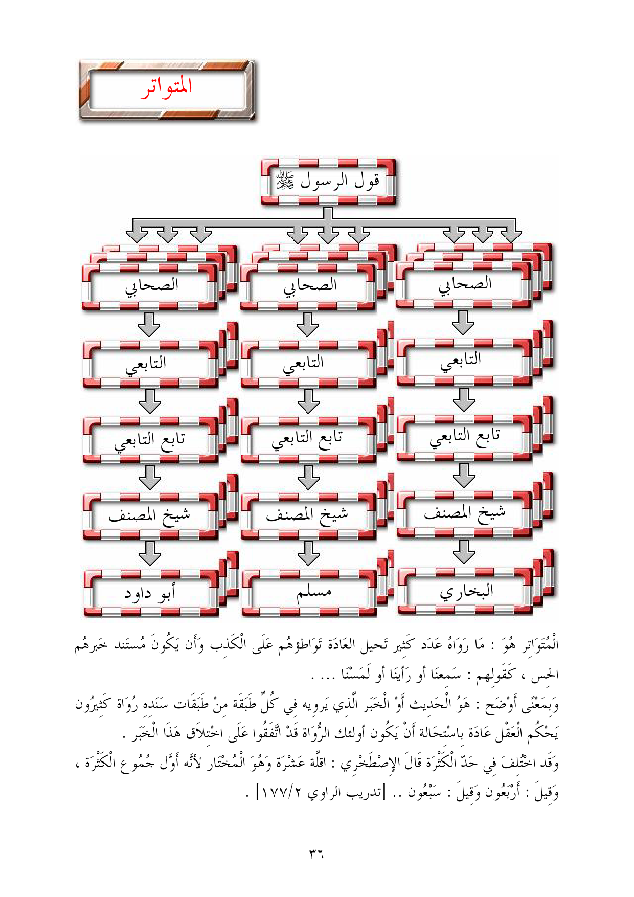 وَبِمَعْنًى أَوْضَح: هَوُ الْحَدِيث أَوْ الْخَبَر الَّذِي يَروِيه فِي كُلِّ طَبَقَة مِنْ طَبَقَات سَنَدِهِ رُوَاة كَثِيرُون يَحْكُم الْعَقْل عَادَة بِاسْتِحَالة أَنْ يَكُون أولئك الرُّوَاة قَدْ اتَّفَقُوا عَلَى اخْتِلاَق هَذَا الْخَبَر.