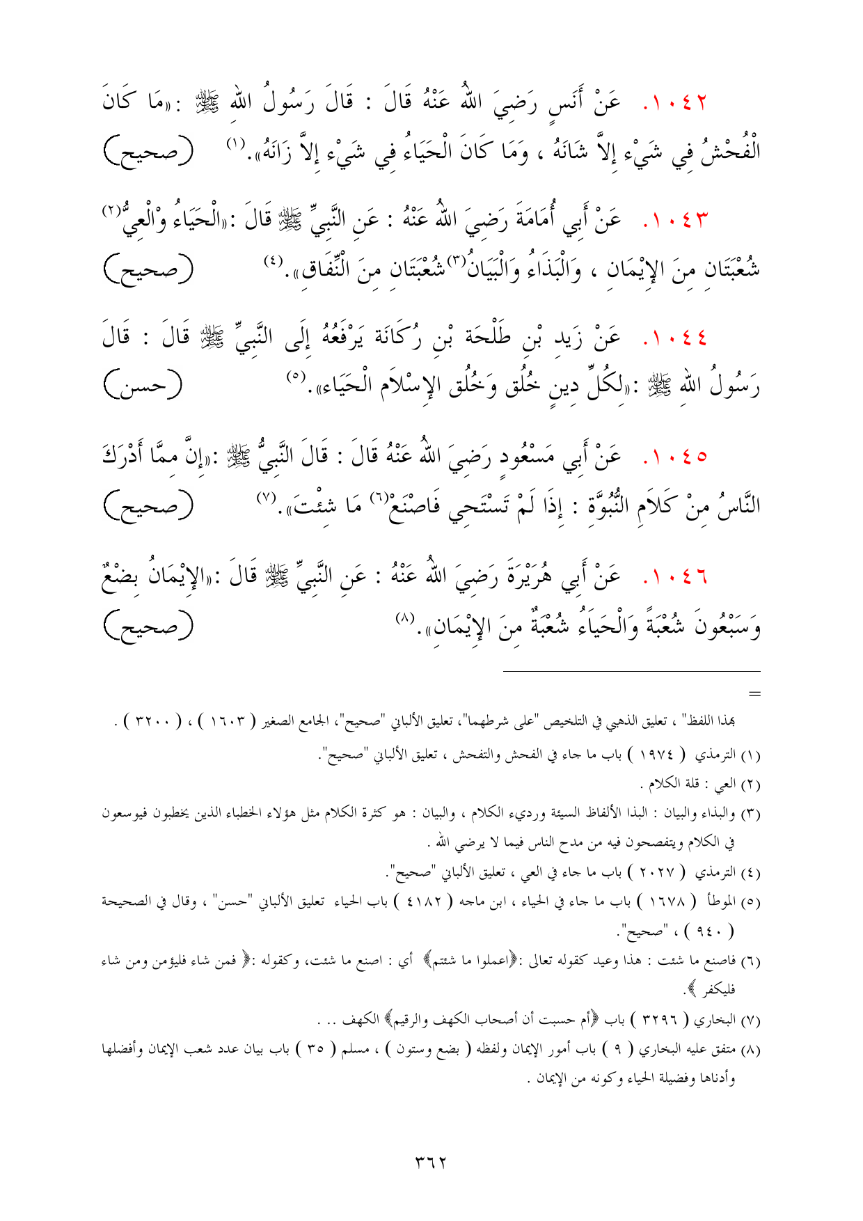 1046 - عَنْ أَبِي هُرَيْرَةَ رَضِيَ اللهُ عَنْهُ: عَنِ النَّبِيِّ - صلى الله عليه وسلم - قَالَ: «الإِيْمَانُ بِضْعٌ وَسَبْعُونَ شُعْبَةً وَالْحَياَءُ شُعْبَةٌ مِنَ الإِيْمَانِ». (¬8) =صحيح