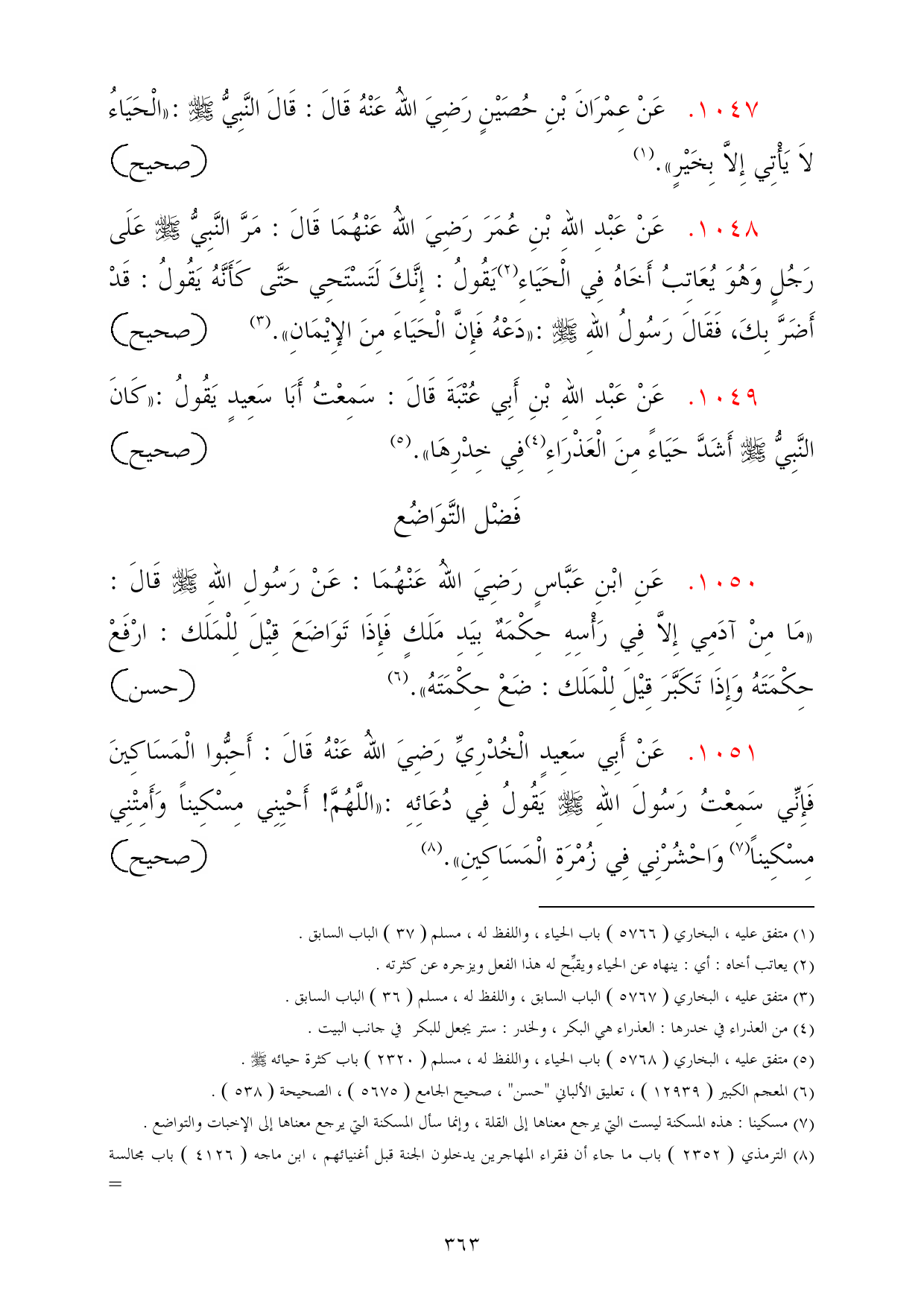 1051 - عَنْ أَبِي سَعِيدٍ الْخُدْرِيِّ رَضِيَ اللهُ عَنْهُ قَالَ: أَحِبُّوا الْمَسَاكِينَ فَإِنِّي سَمِعْتُ رَسُولَ اللهِ - صلى الله عليه وسلم - يَقُولُ فِي دُعَائِهِ: «اللَّهُمَّ! أَحْيِنِي مِسْكِيناً وَأَمِتْنِي مِسْكِيناً (¬7) وَاحْشُرْنِي فِي زُمْرَةِ الْمَسَاكِينِ». (¬8) =صحيح