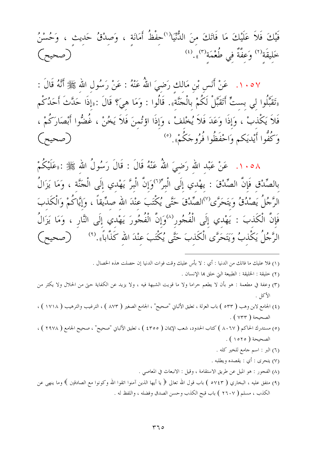 1058 - عَنْ عَبْدِ اللهِ رَضِيَ اللهُ عَنْهُ قَالَ: قَالَ رَسُولُ اللهِ - صلى الله عليه وسلم -: «عَلَيْكُمْ بِالصِّدْقِ فَإِنَّ الصِّدْقَ: يِهْدِي إِلَى الْبِرِّ (¬6) وَإِنَّ الْبِرَّ يَهْدِي إِلَى الْجَنَّةِ، وَمَا يَزَالُ الرَّجُلُ يَصْدُقُ وَيِتَحَرَّى (¬7) الصِّدْقَ حَتَّى يُكْتَبَ عِنْدَ اللهِ صِدِّيقاً، وَإِيَّاكُمْ وَالْكَذِبَ فَإِنَّ الْكَذِبَ: يَهْدِي إِلَى الْفُجُورِ (¬8) وَإِنَّ الْفُجُورَ يَهْدِي إِلَى النَّارِ، وَمَا يَزَالُ الرَّجُلُ يَكْذِبُ وَيَتَحَرَّى الْكَذِبَ حَتَّى يُكْتَبَ عِنْدَ اللهِ كَذَّاباً». (¬9) =صحيح