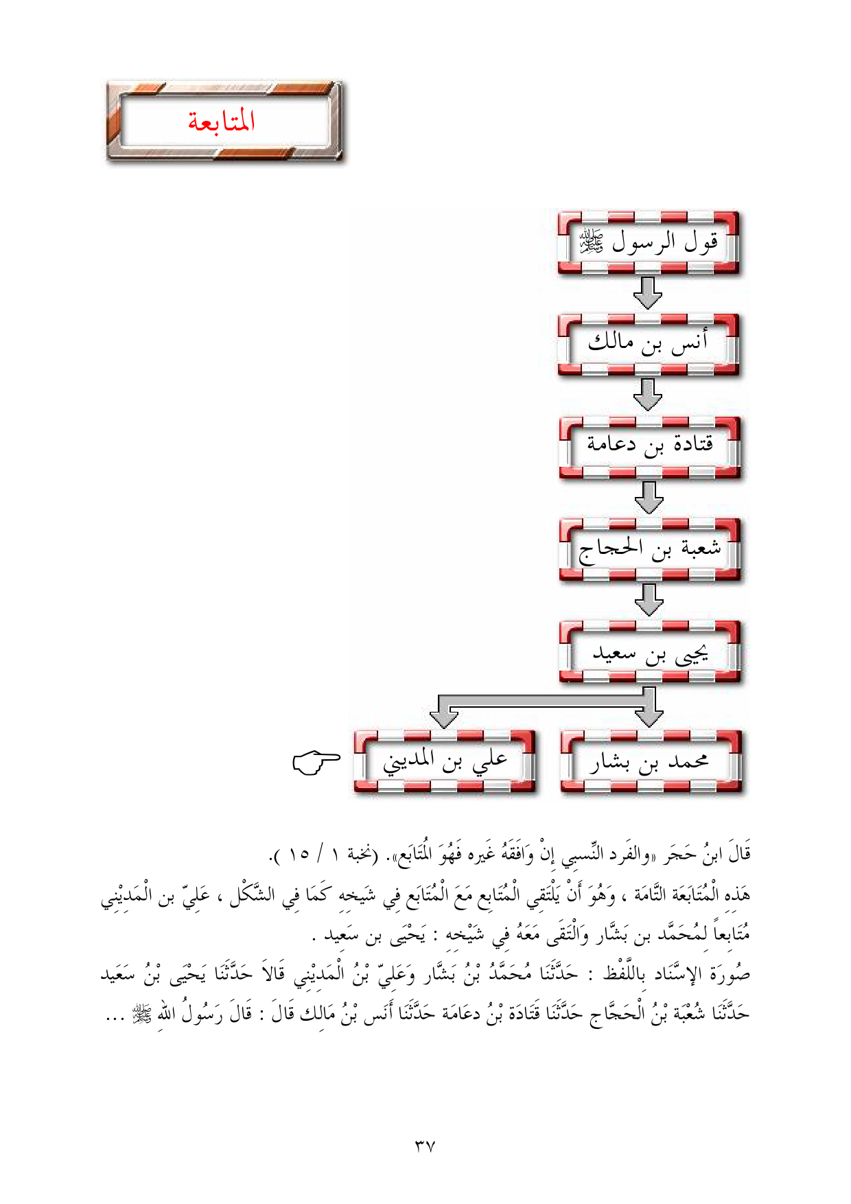 هَذِهِ الْمُتَابَعَة التَّامَة، وَهُوَ أَنْ يَلْتَقِي الْمُتَابِع مَعَ الْمُتَابَع فِي شَيخِهِ كَمَا فِي الشَّكْل، عَلِيّ بن الْمَدِيْنِي مُتَابِعاً لِمُحَمَّد بن بَشَّار وَالْتَقَى مَعَهُ فِي شَيْخِهِ: يَحْيَى بن سَعِيد.