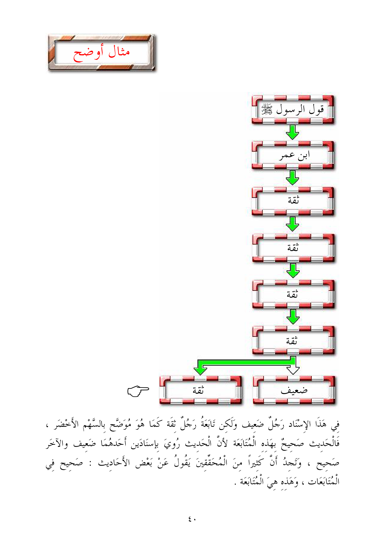 فِي هَذَا الإِسْنَاد رَجُلٌ ضَعِيف وَلَكِن تَابَعَةُ رَجُلٌ ثِقَة كَمَا هُوَ مُوَضَّح بِالسَّهْم الأَخْضَر، فَالْحَدِيث صَحِيحٌ بِهَذِهِ الْمُتَابَعَة لأنَّ الْحَدِيث رُويَ بِإسنَادَين أَحَدهُمَا ضَعِيف والآخَر صَحِيح، وَتَجِدُ أَنَّ كَثِيراً مِنَ الْمُحَقِّقِينَ يَقُولُ عَنْ بَعْض الأَحَادِيث: صَحِيح فِي الْمُتَابَعَات، وَهَذِهِ هِيَ الْمُتَابَعَة.