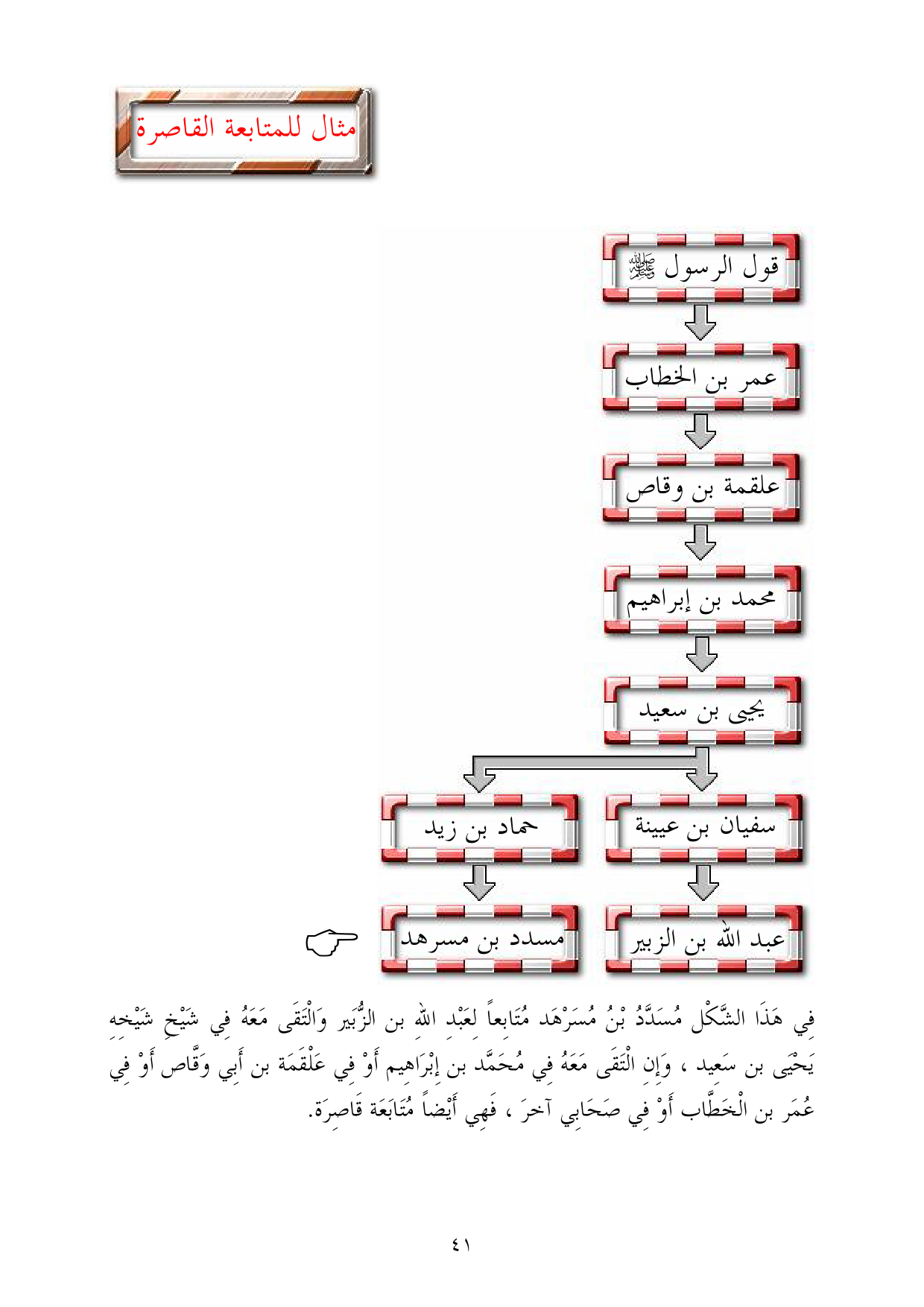 فِي هَذَا الشَّكْل مُسَدَّدُ بْنُ مُسَرْهَد مُتَابِعاً لِعَبْدِ اللهِ بن الزُّبَير وَالْتَقَى مَعَهُ فِي شَيْخِ شَيْخِهِ يَحْيَى بن سَعِيد، وَإِنِ الْتَقَى مَعَهُ فِي مُحَمَّد بن إِبْرَاهِيم أَوْ فِي عَلْقَمَة بن أَبِي وَقَّاص أَوْ فِي عُمَر بن الْخَطَّاب أَوْ فِي صَحَابِي آخرَ، فَهِي أَيْضاً مُتَابَعَة قَاصِرَة.