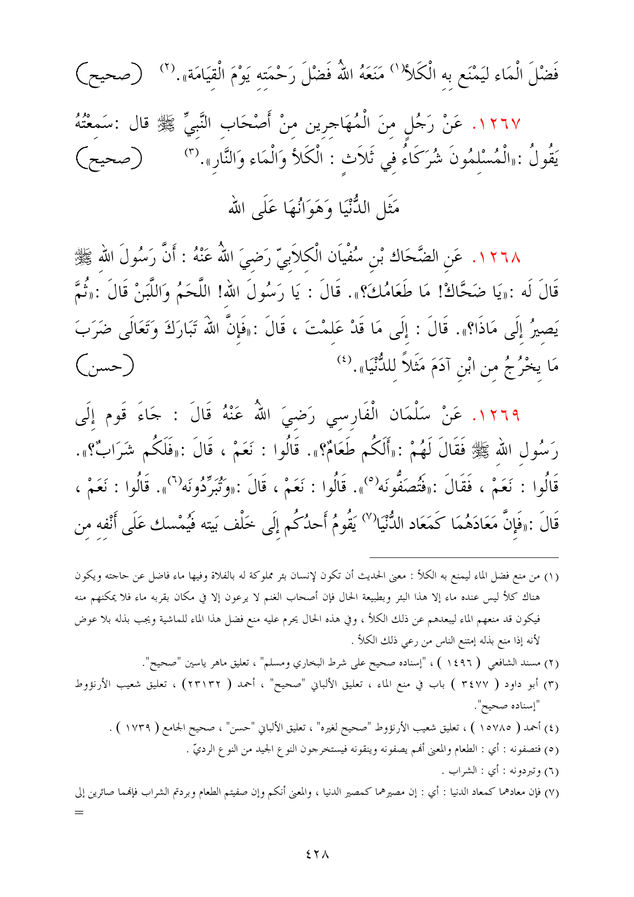 (¬3) أبو داود (3477) باب في منع الماء، تعليق الألباني "صحيح"، أحمد (23132)، تعليق شعيب الأرنؤوط "إسناده صحيح".