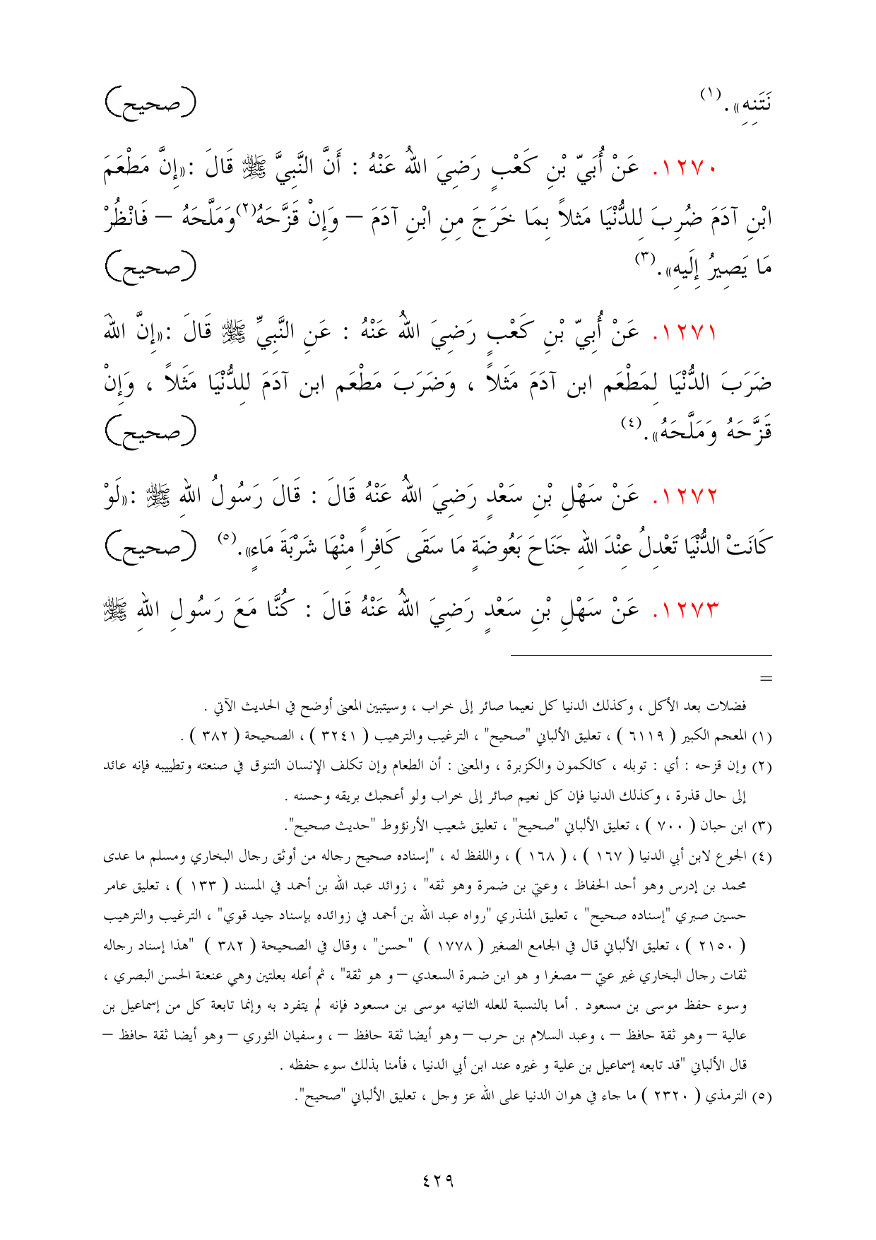 1271 - عَنْ أُبِيّ بْنِ كَعْبٍ رَضِيَ اللهُ عَنْهُ: عَنِ النَّبِيِّ - صلى الله عليه وسلم - قَالَ: «إِنَّ اللهَ ضَرَبَ الدُّنْيَا لِمَطْعَم ابن آدَمَ مَثَلاً، وَضَرَبَ مَطْعَم ابن آدَمَ للِدُّنْيَا مَثَلاً، وَإِنْ قَزَّحَهُ وَمَلَّحَهُ». (¬4) =صحيح