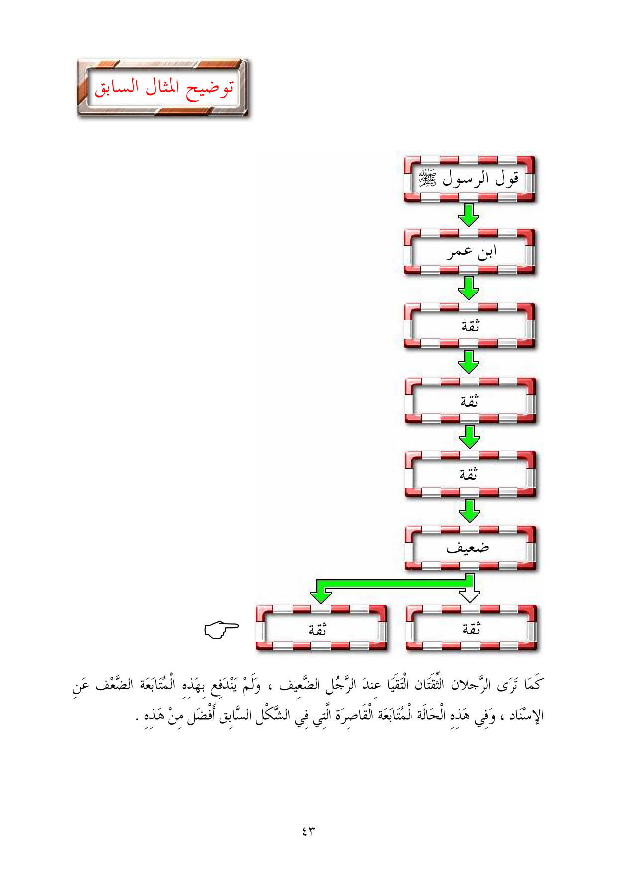 كَمَا تَرَى الرَّجلان الثِّقَتَان الْتَقَيَا عِندَ الرَّجُل الضَّعِيف، وَلَمْ يَنْدَفِع بِهَذِهِ الْمُتَابَعَة الضَّعْف عَنِ الإسْنَاد، وَفِي هَذِهِ الْحَالَة الْمُتَابَعَة الْقَاصِرَة الَّتِي فِي الشَّكْل السَّابِق أَفْضَل مِنْ هَذِهِ.