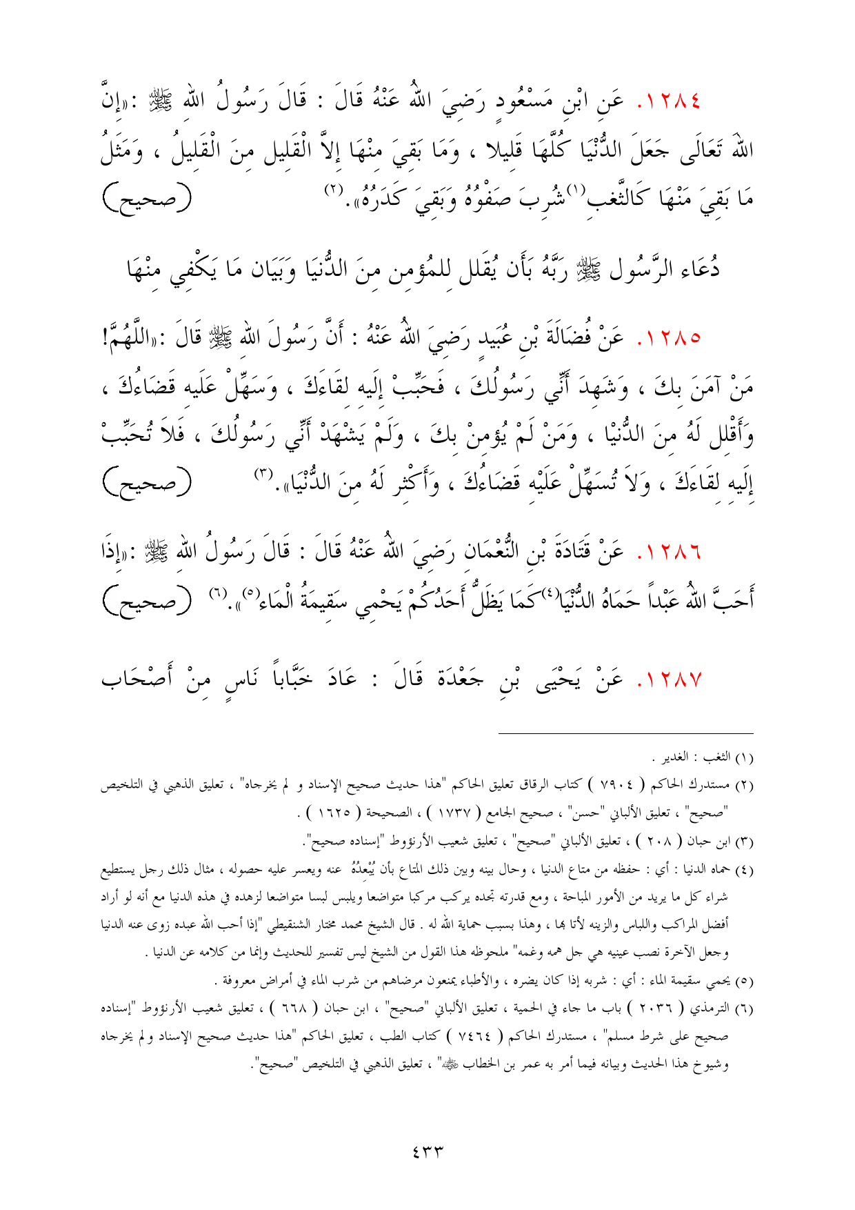 1286 - عَنْ قَتَادَةَ بْنِ النُّعْمَانِ رَضِيَ اللهُ عَنْهُ قَالَ: قَالَ رَسُولُ اللهِ - صلى الله عليه وسلم -: «إِذَا أَحَبَّ اللهُ عَبْداً حَمَاهُ الدُّنْيَا (¬4) كَمَا يَظَلُّ أَحَدُكُمْ يَحْمِي سَقِيمَةُ الْمَاء (¬5)». (¬6) =صحيح