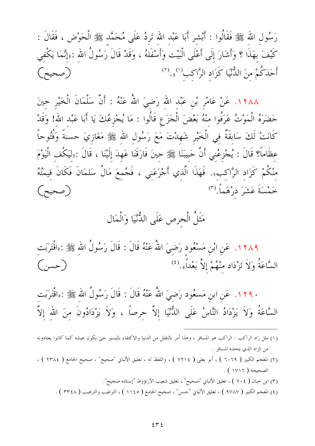 1288 - عَنْ عَامْرِ بْنِ عَبْدِ اللهِ رَضِيَ اللهُ عَنْهُ: أَنَّ سَلْمَانَ الْخَيْرِ حِينَ حَضَرَهُ الْمَوْتُ عَرَفُوا مِنْهُ بَعْضَ الْجَزَعِ قَالُوا: مَا يُجْزِعُكَ يَا أَبَا عَبْدِ اللهِ! وَقَدْ كَانَتْ لَكَ سَابِقَةٌ فِي الْخَيْرِ شَهِدْتَ مَعَ رَسُولِ اللهِ - صلى الله عليه وسلم - مَغَازِيَ حسنةً وَفُتُوحاً عِظَاماً؟ قَالَ: يُجْزِعُنِي أَنَّ حَبِيبَنَا - صلى الله عليه وسلم - حِينَ فَارَقَنَا عَهِدَ إِلَيْنَا، قَالَ: «لِيَكْفِ الْيَوْمَ مِنْكُمْ كَزَادِ الرَّاكِبِ». فَهَذَا الَّذِي أَجْزَعَنِي، فَجُمِعَ مَالُ سَلمَانَ فَكَانَ قِيمَتُهُ خَمْسَةَ عَشَرَ دِرْهَماً. (¬3) =صحيح