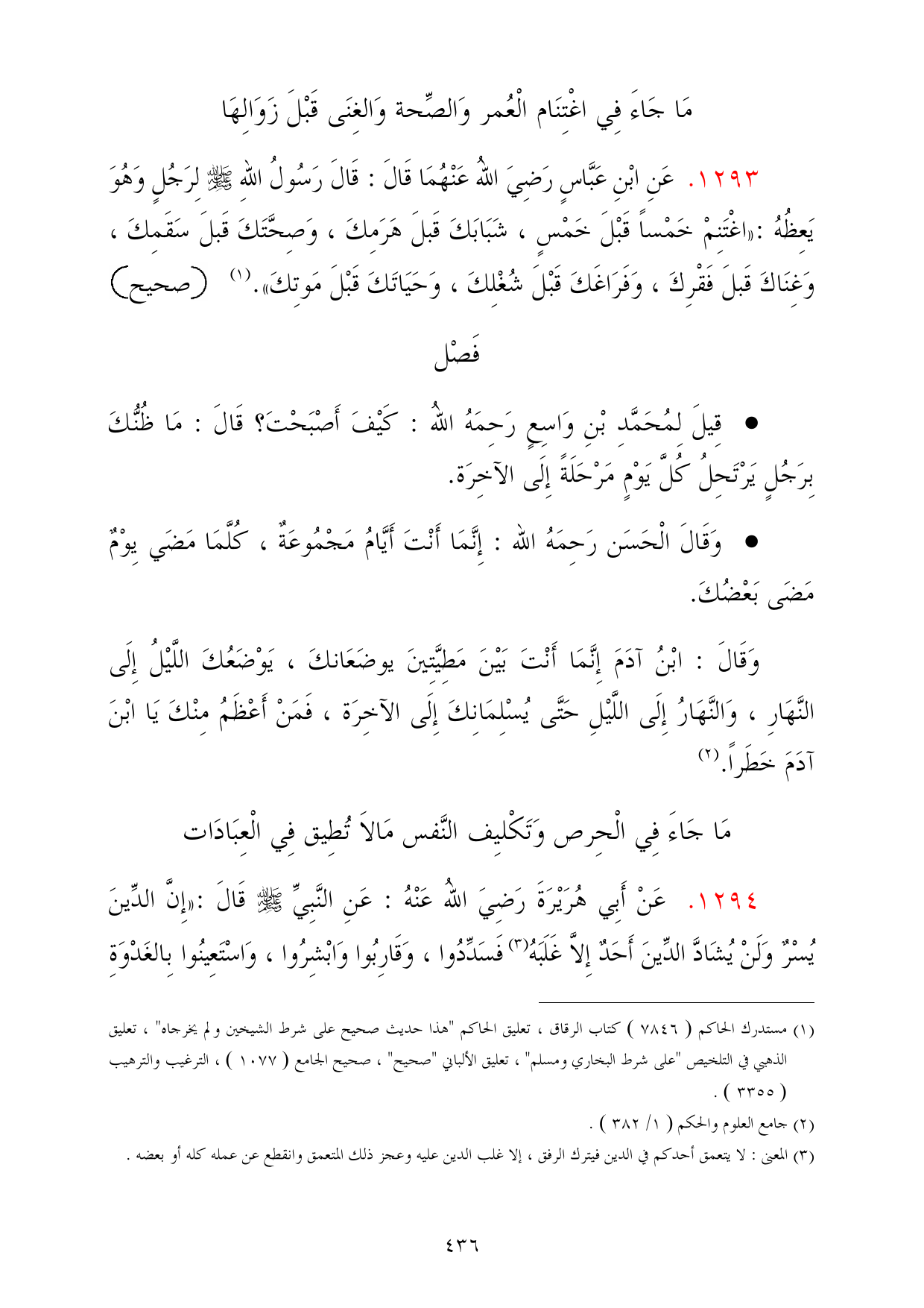 (¬1) مستدرك الحاكم (7846) كتاب الرقاق، تعليق الحاكم "هذا حديث صحيح على شرط الشيخين ولم يخرجاه"، تعليق الذهبي في التلخيص "على شرط البخاري ومسلم"، تعليق الألباني "صحيح"، صحيح الجامع (1077)، الترغيب والترهيب (3355).