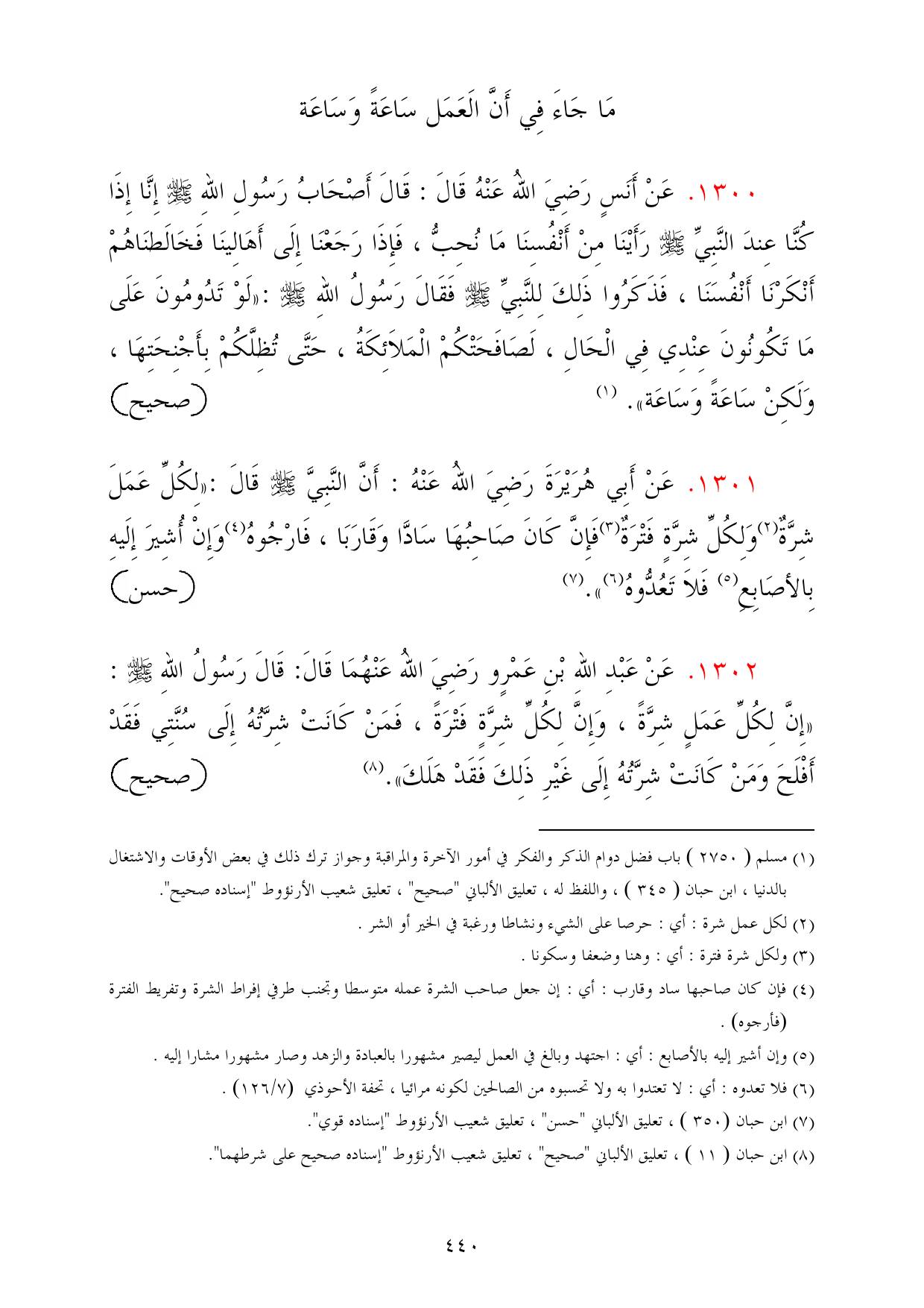 1302 - عَنْ عَبْدِ اللهِ بْنِ عَمْرٍو رَضِيَ اللهُ عَنْهُمَا قَالَ: قَالَ رَسُولُ اللهِ - صلى الله عليه وسلم -: «إِنَّ لِكُلِّ عَمَلٍ شِرَّةً، وَإِنَّ لِكُلِّ شِرَّةٍ فَتْرَةً، فَمَنْ كَانَتْ شِرَّتُهُ إِلَى سُنَّتِي فَقَدْ أَفْلَحَ وَمَنْ كَانَتْ شِرَّتُهُ إِلَى غَيْرِ ذَلِكَ فَقَدْ هَلَكَ». (¬8) =صحيح