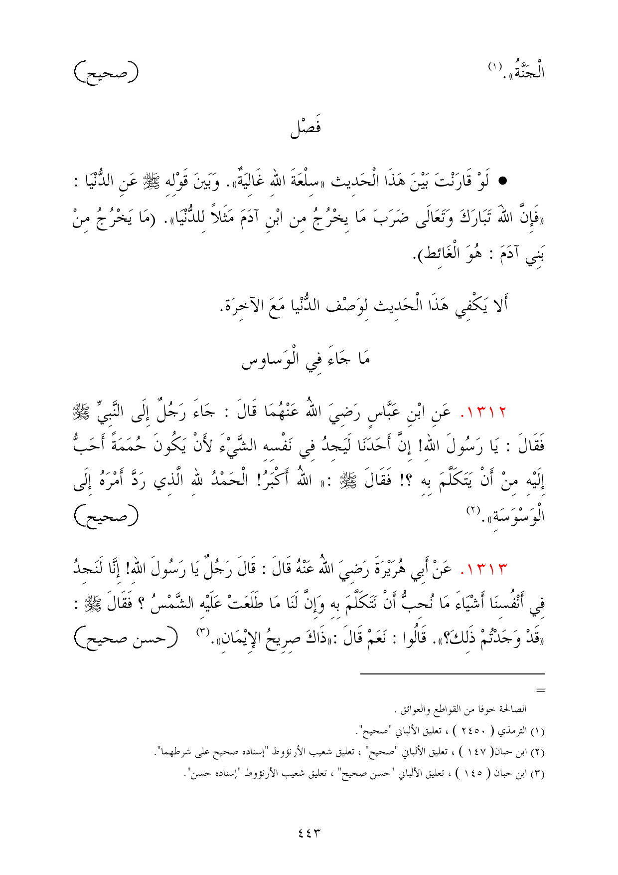 1313 - عَنْ أَبِي هُرَيْرَةَ رَضِيَ اللهُ عَنْهُ قَالَ: قَالَ رَجُلٌ يَا رَسُولَ اللهِ! إِنَّا لَنَجِدُ فِي أَنْفُسِنَا أَشْيَاءَ مَا نُحِبُّ أَنْ نَتَكَلَّمَ بِهِ وَإِنَّ لَنَا مَا طَلَعَتْ عَلَيْهِ الشَّمْسُ؟ فَقَالَ - صلى الله عليه وسلم -: «قَدْ وَجَدْتُمْ ذَلِكَ؟». قَالُوا: نَعَمْ قَالَ: «ذَاكَ صِرِيحُ الإِيْمَانِ». (¬3) =حسن صحيح