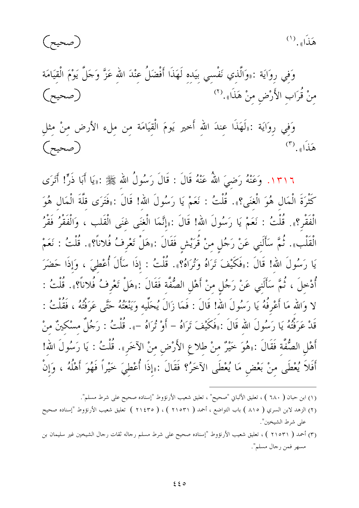 1316 - وَعَنْهُ رَضِيَ اللهُ عَنْهُ قَالَ: قَالَ رَسُولُ اللهِ - صلى الله عليه وسلم -: «يَا أَبَا ذَرٍّ! أَتَرَى كَثْرَةَ الْمَالِ هُوَ الْغِنَى؟». قُلْتُ: نَعَمْ يَا رَسُولَ اللهِ! قَالَ: «فَتَرَى قِلَّةَ الْمَالِ هُوَ الْفَقْرِ؟». قُلْتُ: نَعَمْ يَا رَسُولَ اللهِ! قَالَ: «إِنَّمَا الْغِنَى غِنَى الْقَلب، وَالْفَقْرُ فَقْرُ الْقَلْب». ثُمَّ سَأَلَنِي عَنْ رَجُلٍ مِنْ قُرَيْشٍ فَقَالَ: «هَلْ تَعْرِفُ فُلاناً؟». قُلْتُ: نَعَمْ يَا رَسُولَ اللهِ! قَالَ: «فَكَيْفَ تَرَاهُ وَتُرَاهُ؟». قُلْتُ: إِذَا سَأَلَ أُعْطِيَ، وَإِذَا حَضَرَ أُدْخِلَ، ثُمَّ سَأَلَنِي عَنْ رَجُلٍ مِنْ أَهْلِ الصُّفَّةِ فَقَالَ: «هَلْ تَعْرِفُ فُلاناً؟». قُلْتُ: لا وَاللهِ مَا أَعْرِفُهُ يَا رَسُولَ اللهِ! قَالَ: فَمَا زَالَ يُحَلِّيهِ وَيَنْعَتُهُ حَتَّى عَرَفْتُهُ، فَقُلْتُ: قَدْ عَرَفْتُهُ يَا رَسُولَ اللهِ قَالَ: «فَكَيْفَ تَرَاهُ - أَوْ تُرَاهُ -». قُلْتُ: رَجُلٌ مِسْكِينٌ مِنْ أَهْلِ الصُّفَّةِ فَقَالَ: «هُوَ خَيْرٌ مِنْ طِلاعِ الأَرْضِ مِنْ الآخَرِ». قُلْتُ: يَا رَسُولَ اللهِ! أَفَلاَ يُعْطَى مِنْ بَعْضِ مَا يُعْطَى الآخَرُ؟ فَقَالَ: «إِذَا أُعْطِيَ خَيْراً فَهُوَ أَهْلُهُ، وَإِنْ