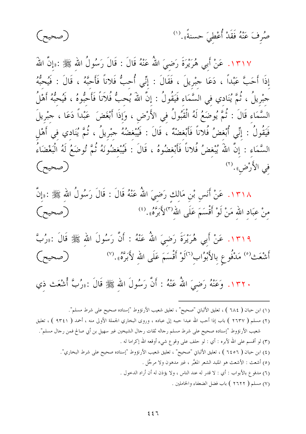 1319 - عَنْ أَبِي هُرَيْرَةَ رَضِيَ اللهُ عَنْهُ: أَنَّ رَسُولَ اللهِ - صلى الله عليه وسلم - قَالَ: «رُبَّ أَشْعَث (¬5) مَدْفُوعٍ بِالأَبْوُابِ (¬6) لَوْ أَقْسَمَ عَلَى اللهِ لأَبَرَّهُ». (¬7) =صحيح