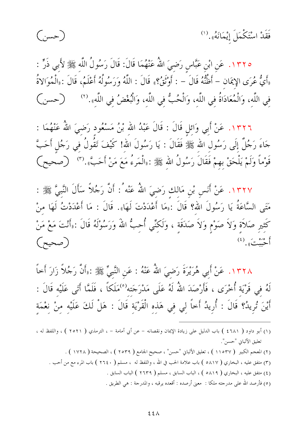 1328 - عَنْ أَبِي هُرَيْرَةَ رَضِيَ اللهُ عَنْهُ: عَنِ النَّبِيِّ - صلى الله عليه وسلم -: «أَنَّ رَجُلاً زَارَ أَخاً لَهُ فِي قَرْيَةِ أُخْرَى، فَأَرْصَدَ اللهُ لَهُ عَلَى مَدْرَجَتِهِ (¬5) مَلَكاً، فَلَمَّا أَتَى عَلَيْهِ قَالَ: أَيْنَ تُرِيدُ؟ قَالَ: أُرِيدُ أَخاً لِي فِي هَذِهِ الْقَرْيَةِ قَالَ: هَلْ لَكَ عَلَيْهِ مِنْ نِعْمَةٍ