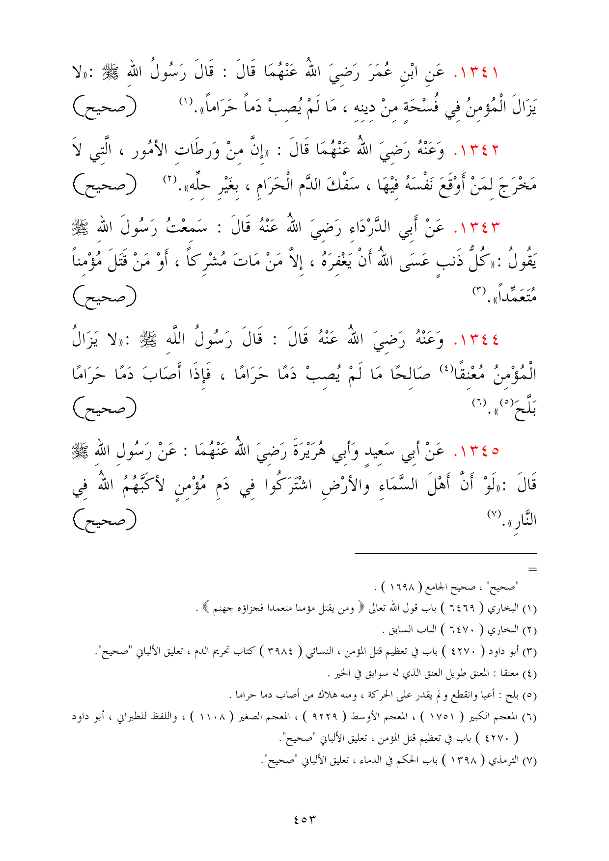 1345 - عَنْ أبِي سَعِيدٍ وَأبِي هُرَيْرَةَ رَضِيَ اللهُ عَنْهُمَا: عَنْ رَسُولِ اللهِ - صلى الله عليه وسلم - قَالَ: «لَوْ أَنَّ أَهْلَ السَّمَاءِ والأرْضِ اشْتَرَكُوا فِي دَمِ مُؤْمِنٍ لأكَبَّهُمُ اللهُ فِي النَّارِ». (¬7) =صحيح