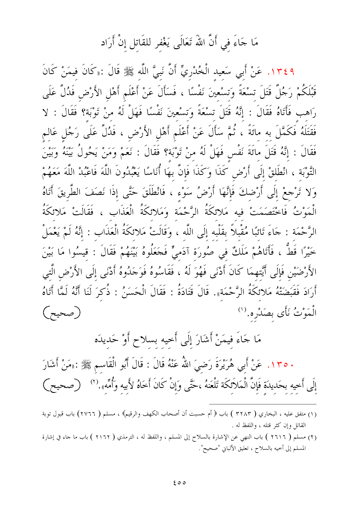 1350 - عَنْ أَبِي هُرَيْرَةَ رَضِيَ اللهُ عَنْهُ قَالَ: قَالَ أَبُو الْقَاسِمِ - صلى الله عليه وسلم -: «مَنْ أَشَارَ إِلَى أَخِيهِ بِحَدِيدَةٍ فَإِنَّ الْمَلاَئِكَة تَلْعَنهُ، حَتَّى وَإِنْ كَانَ أَخَاهُ لأَبِيهِ وَأُمِّهِ». (¬2) =صحيح