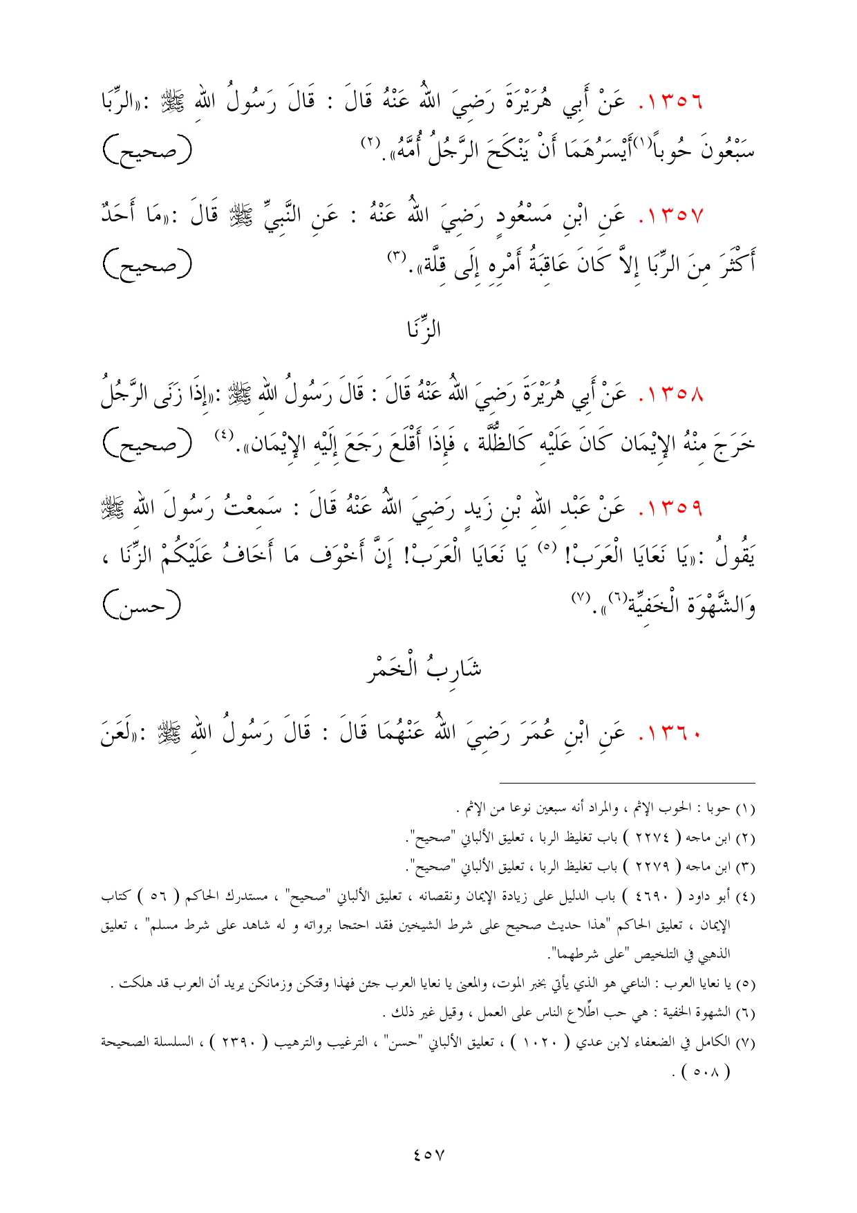 1356 - عَنْ أَبِي هُرَيْرَةَ رَضِيَ اللهُ عَنْهُ قَالَ: قَالَ رَسُولُ اللهِ - صلى الله عليه وسلم -: «الرِّبَا سَبْعُونَ حُوباً (¬1) أَيْسَرُهَمَا أَنْ يَنْكَحَ الرَّجُلُ أُمَّهُ». (¬2) =صحيح