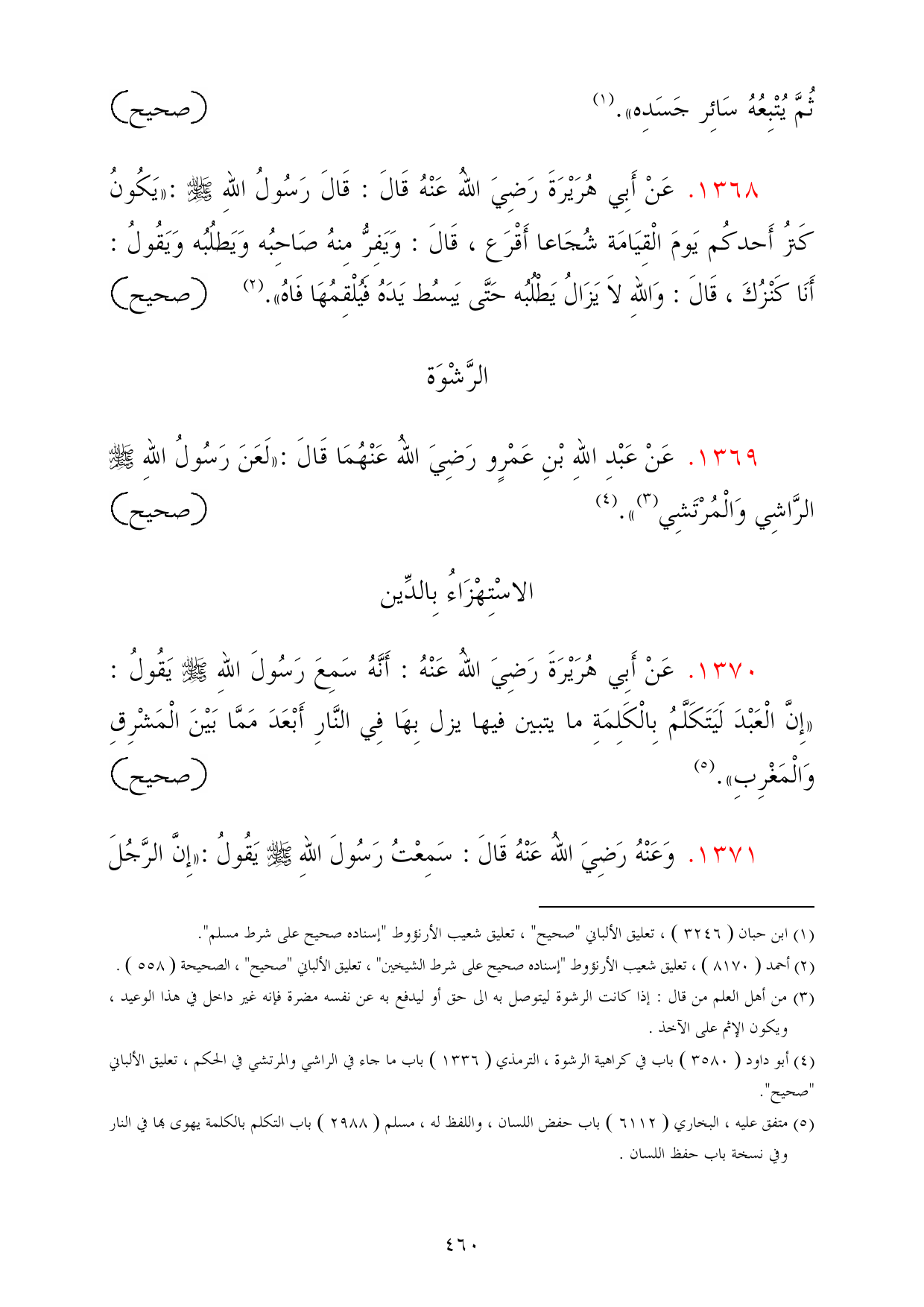 1369 - عَنْ عَبْدِ اللهِ بْنِ عَمْرٍو رَضِيَ اللهُ عَنْهُمَا قَالَ: «لَعَنَ رَسُولُ اللهِ - صلى الله عليه وسلم - الرَّاشِي وَالْمُرْتَشِي (¬3)». (¬4) =صحيح