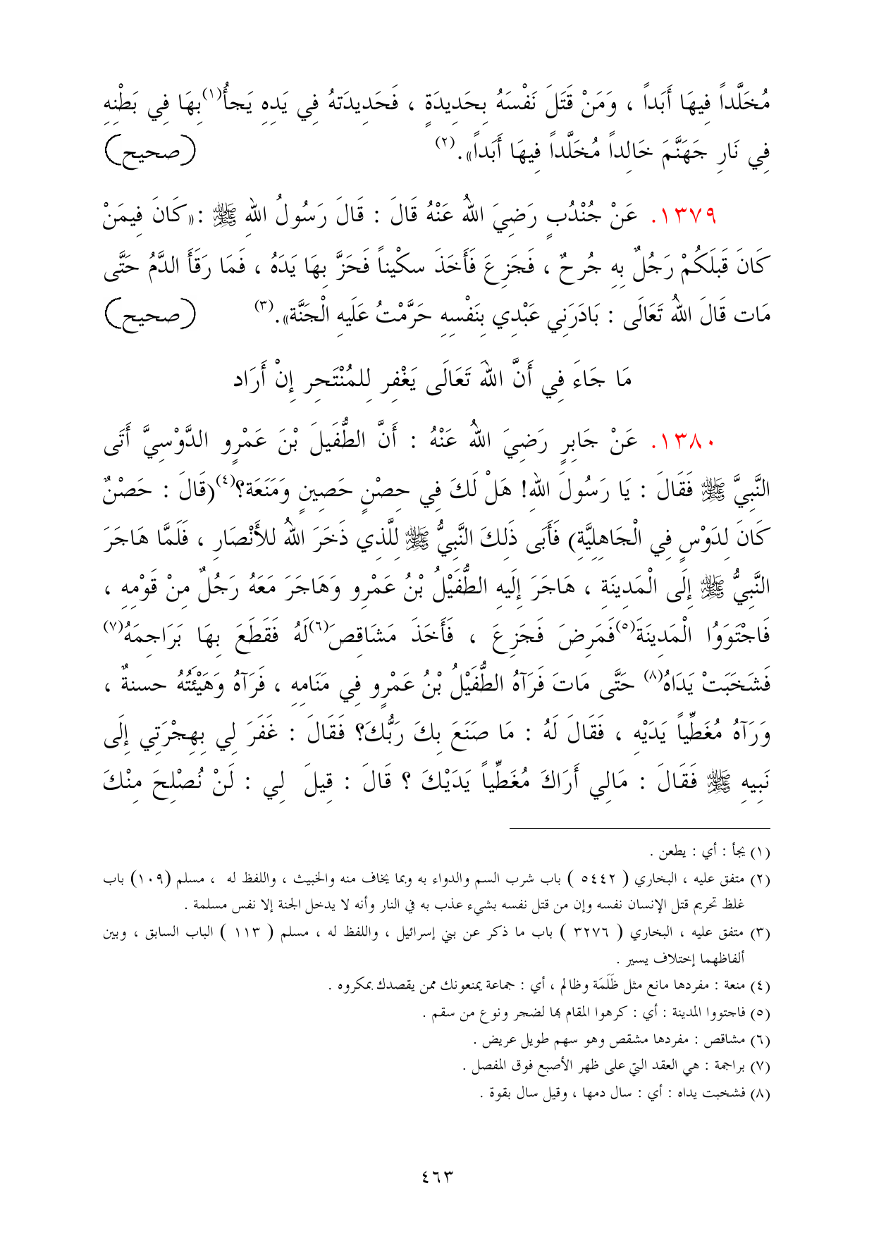 1380 - عَنْ جَابِرٍ رَضِيَ اللهُ عَنْهُ: أَنَّ الطُّفَيلَ بْنَ عَمْرٍو الدَّوْسِيَّ أَتَى النَّبِيَّ - صلى الله عليه وسلم - فَقَالَ: يَا رَسُولَ اللهِ! هَلْ لَكَ فِي حِصْنٍ حَصِينٍ وَمَنَعَة؟ (¬4) (قَالَ: حَصْنٌ كَانَ لِدَوْسٍ فِي الْجَاهِلِيَّةِ) فَأَبَى ذَلِكَ النَّبِيُّ - صلى الله عليه وسلم - لِلَّذِي ذَخَرَ اللهُ للأَنْصَارِ، فَلَمَّا هَاجَرَ النَّبِيُّ - صلى الله عليه وسلم - إِلَى الْمَدِينَةِ، هَاجَرَ إِلَيهِ الطُّفَيْلُ بْنُ عَمْرِو وَهَاجَرَ مَعَهُ رَجُلٌ مِنْ قَوْمِهِ، فَاجْتَوَوُا الْمَدِينَةَ (¬5) فَمَرِضَ فَجَزِعَ، فَأَخَذَ مَشَاقِصَ (¬6) لَهُ فَقَطَعَ بِهَا بَرَاجِمَهُ (¬7) فَشَخَبَتْ يَدَاهُ (¬8) حَتَّى مَاتَ فَرَآهُ الطُّفَيْلُ بْنُ عَمْرٍو فِي مَنَامِهِ، فَرَآهُ وَهَيْئَتُهُ حسنةٌ، وَرَآهُ مُغَطِّياً يَدَيْهِ، فَقَالَ لَهُ: مَا صَنَعَ بِكَ رَبُّكَ؟ فَقَالَ: غَفَرَ لِي بِهِجْرَتِي إِلَى نَبِيهِ - صلى الله عليه وسلم - فَقَالَ: مَالِي أَرَاكَ مُغَطِّياً يَدَيْكَ؟ قَالَ: قِيلَ لِي: لَنْ نُصْلِحَ مِنْكَ