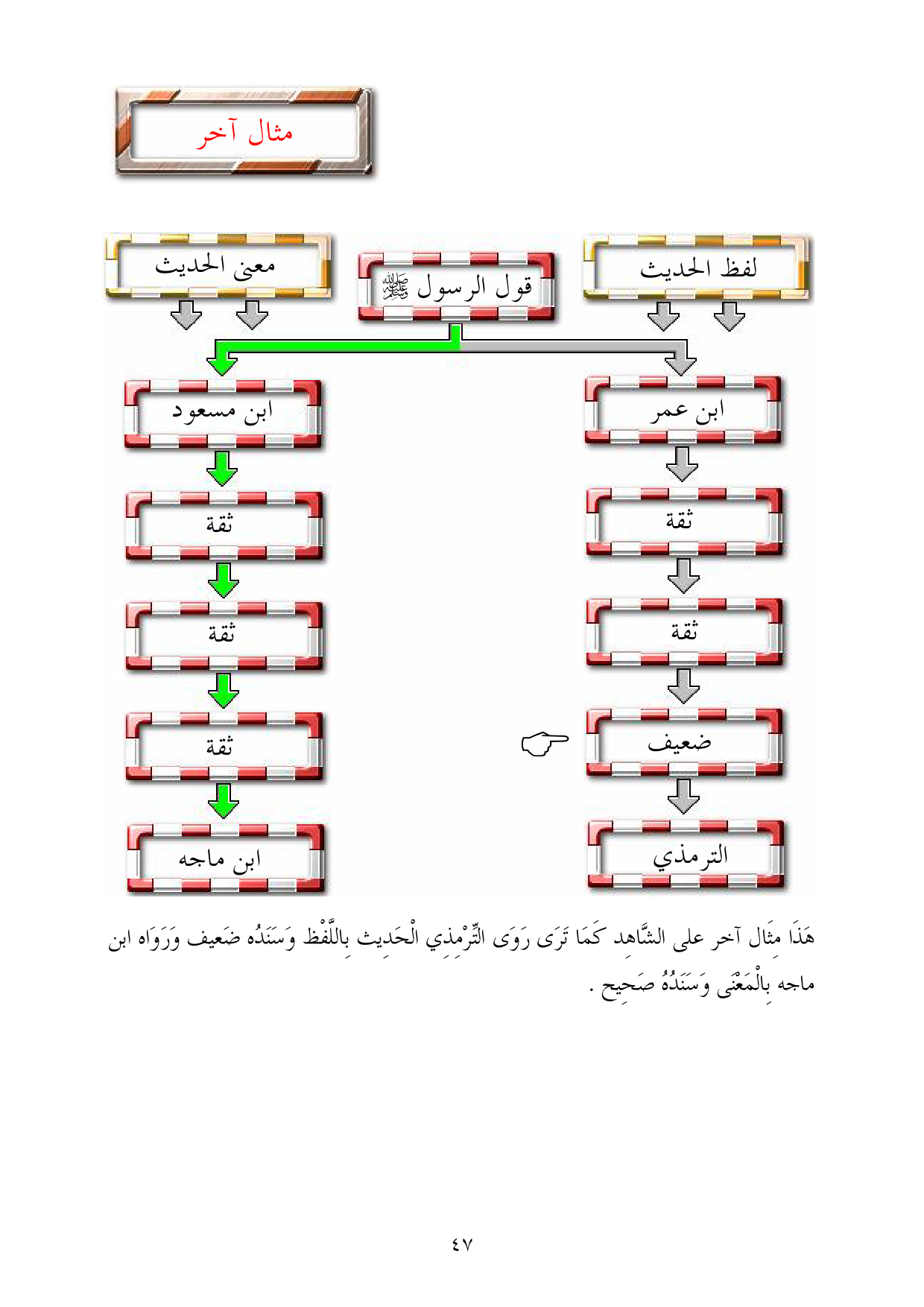 هَذَا مِثَال آخر على الشَّاهِد كَمَا تَرَى رَوَى التِّرْمِذِي الْحَدِيث بِاللَّفْظ وَسَنَدُه ضَعيف وَرَوَاه ابن ماجه بِالْمَعْنَى وَسَنَدُهُ صَحِيح.