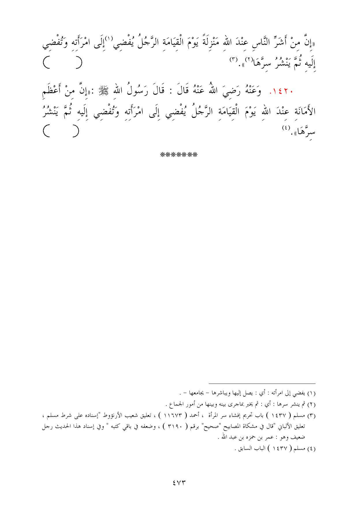 (¬3) مسلم (1437) باب تحريم إفشاء سر المرأة، أحمد (11673)، تعليق شعيب الأرنؤوط "إسناده على شرط مسلم، تعليق الألباني "قال في مشكاة المصابيح "صحيح" برقم (3190)، وضعفه في باقي كتبه " وفي إسناد هذا الحديث رجل ضعيف وهو: عمر بن حمزه بن عبد الله.