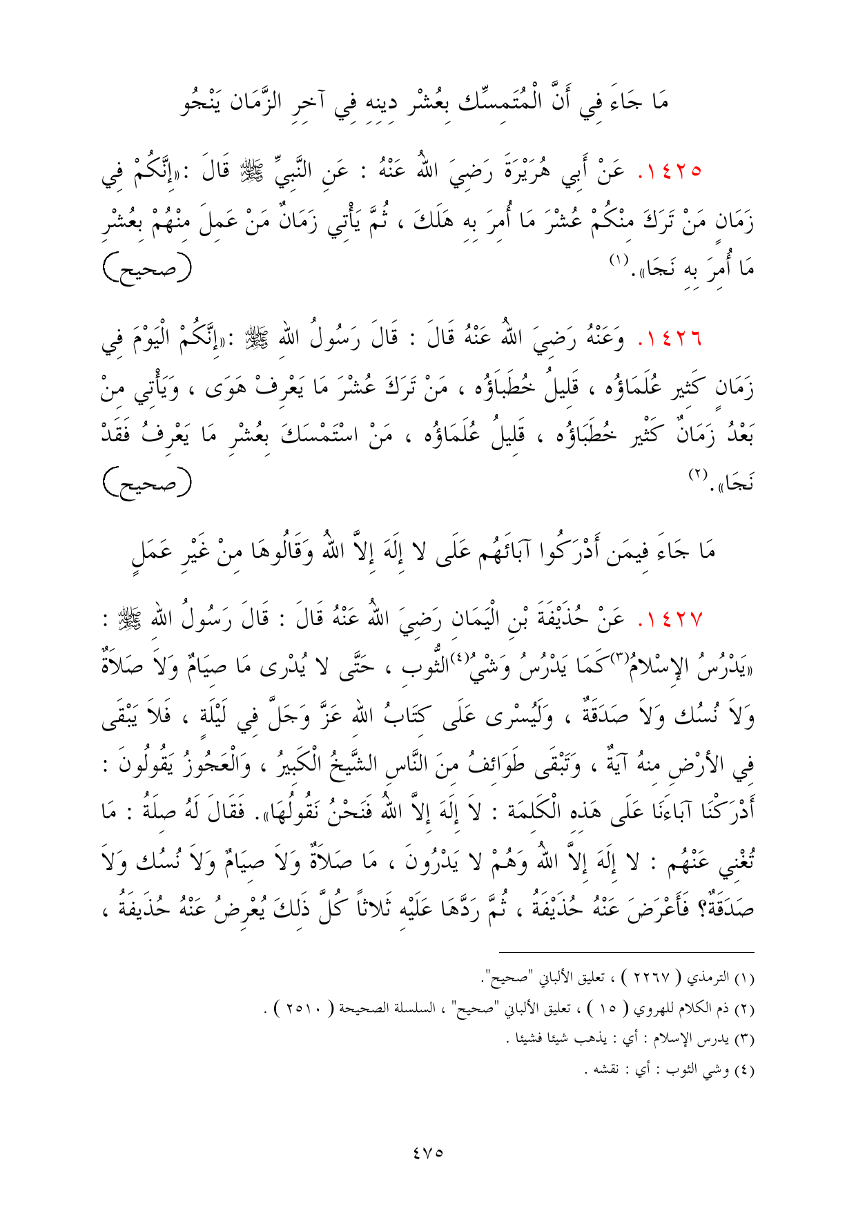 1427 - عَنْ حُذَيْفَةَ بْنِ الْيَمَانِ رَضِيَ اللهُ عَنْهُ قَالَ: قَالَ رَسُولُ اللهِ - صلى الله عليه وسلم -: «يَدْرُسُ الإِسْلامُ (¬3) كَمَا يَدْرُسُ وَشْيُ (¬4) الثُّوبِ، حَتَّى لا يُدْرى مَا صِيَامٌ وَلاَ صَلاَةٌ وَلاَ نُسُك وَلاَ صَدَقَةٌ، وَلَيُسْرى عَلَى كِتَابُ اللهِ عَزَّ وَجَلَّ فِي لَيْلَةٍ، فَلاَ يَبْقَى فِي الأرْضِ مِنهُ آيَةٌ، وَتَبْقَى طَوَائِفُ مِنَ النَّاسِ الشَّيخُ الْكَبِيرُ، وَالْعَجُوزُ يَقُولُونَ: أَدْرَكْنَا آبَاءَنَا عَلَى هَذِهِ الْكَلِمَة: لاَ إِلَهَ إِلاَّ اللهُ فَنَحْنُ نَقُولُهَا». فَقَالَ لَهُ صِلَةُ: مَا تُغْنِي عَنْهُم: لا إِلَهَ إِلاَّ اللهُ وَهُمْ لا يَدْرُونَ، مَا صَلاَةٌ وَلاَ صِيَامٌ وَلاَ نُسُك وَلاَ صَدَقَةٌ؟ فَأَعْرَضَ عَنْهُ حُذَيْفَةُ، ثُمَّ رَدَّهَا عَلَيْهِ ثَلاثاً كُلَّ ذَلِكَ يُعْرِضُ عَنْهُ حُذَيفَةُ،
