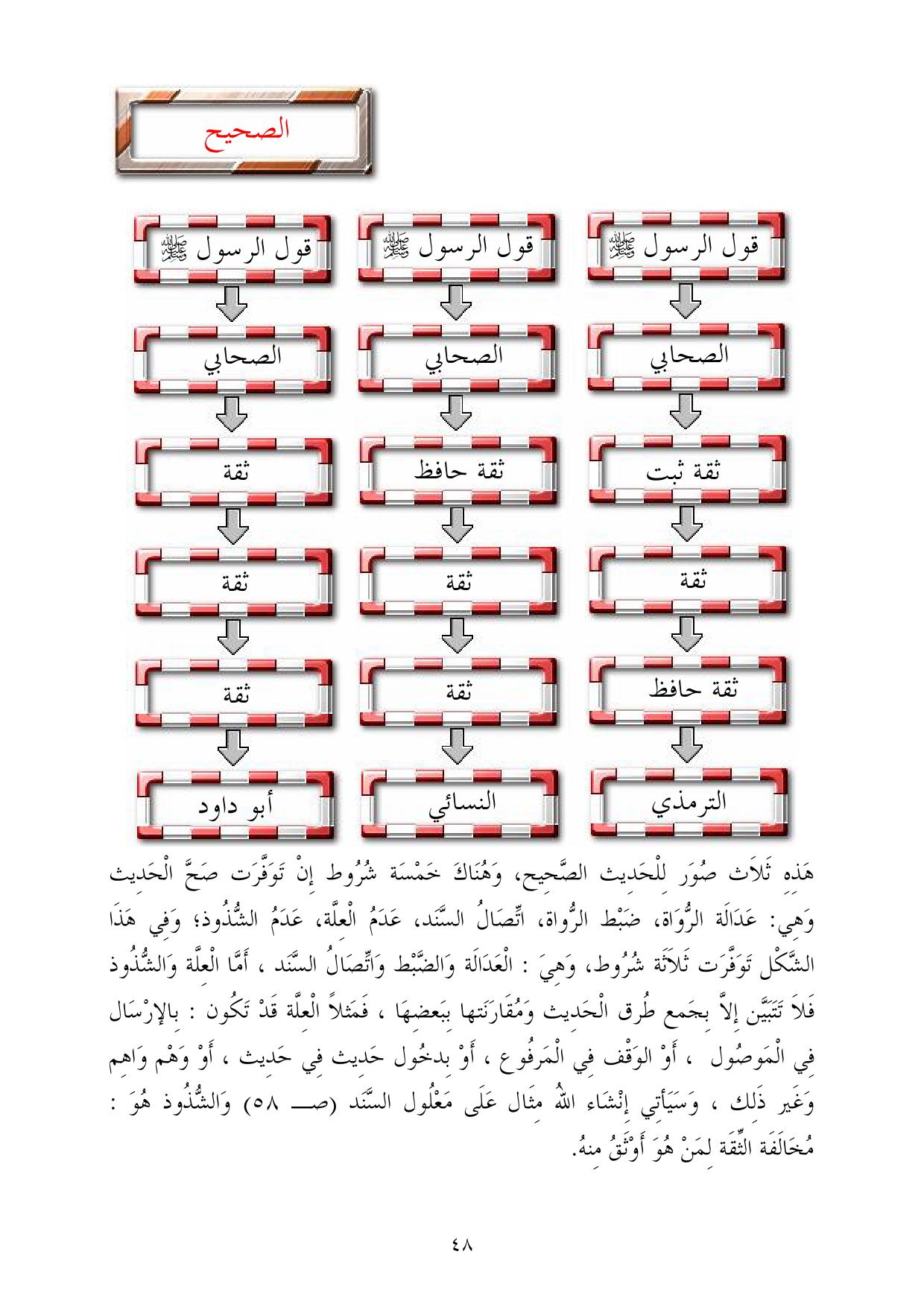 هَذِهِ ثَلاَث صُوَر لِلْحَدِيث الصَّحِيح، وَهُنَاكَ خَمْسَة شُرُوط إِنْ تَوَفَّرَت صَحَّ الْحَدِيث وَهِي: عَدَالَة الرُّوَاة، ضَبْط الرُّواة، اتِّصَالُ السَّنَد، عَدَمُ الْعِلَّة، عَدَمُ الشُّذُوذ؛ وَفِي هَذَا الشَّكْل تَوَفَّرَت ثَلاَثَة شُرُوط، وَهِيَ: الْعَدَالَة وَالضَّبْط وَاتِّصَالُ السَّنَد، أَمَّا الْعِلَّة وَالشُّذُوذ فَلاَ تَتَبَيَّن إِلاَّ بِجَمع طُرق الْحَدِيث وَمُقَارَنَتها بِبَعضِهَا، فَمَثلاً الْعِلَّة قَدْ تَكُون: بِالإرْسَال فِي الْمَوصُول، أَوْ الوَقْف فِي الْمَرفُوع، أَوْ بِدخُول حَدِيث فِي حَدِيث، أَوْ وَهْم وَاهِم وَغَير ذَلِك، وَسَيَأتِي إِنْشَاء اللهُ مِثَال عَلَى مَعْلُول السَّنَد (صـ 58) وَالشُّذُوذ هُوَ: مُخَالَفَة الثِّقَة لِمَنْ هُوَ أَوْثَقُ مِنهُ.