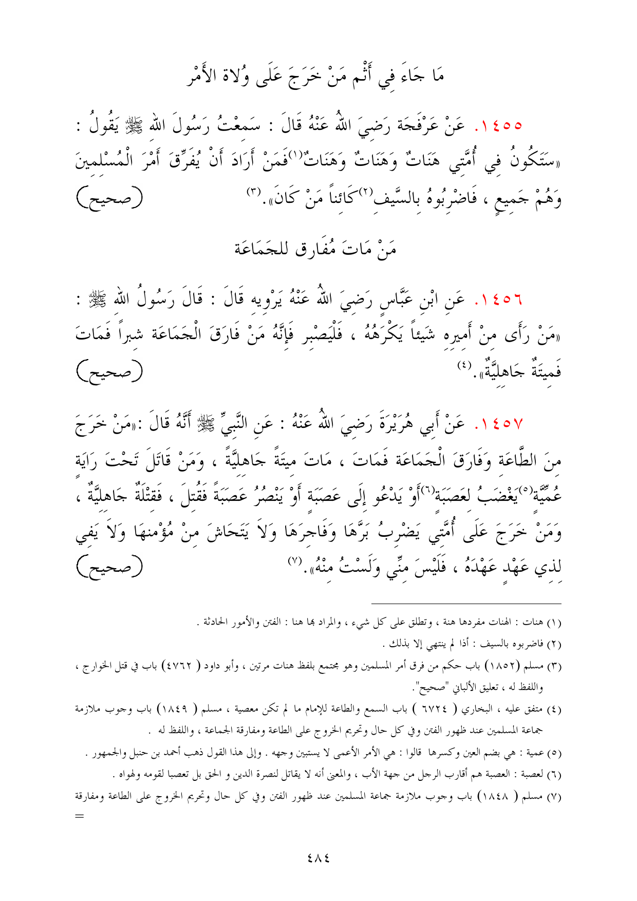 (¬7) مسلم (1848) باب وجوب ملازمة جماعة المسلمين عند ظهور الفتن وفي كل حال وتحريم الخروج على الطاعة ومفارقة =