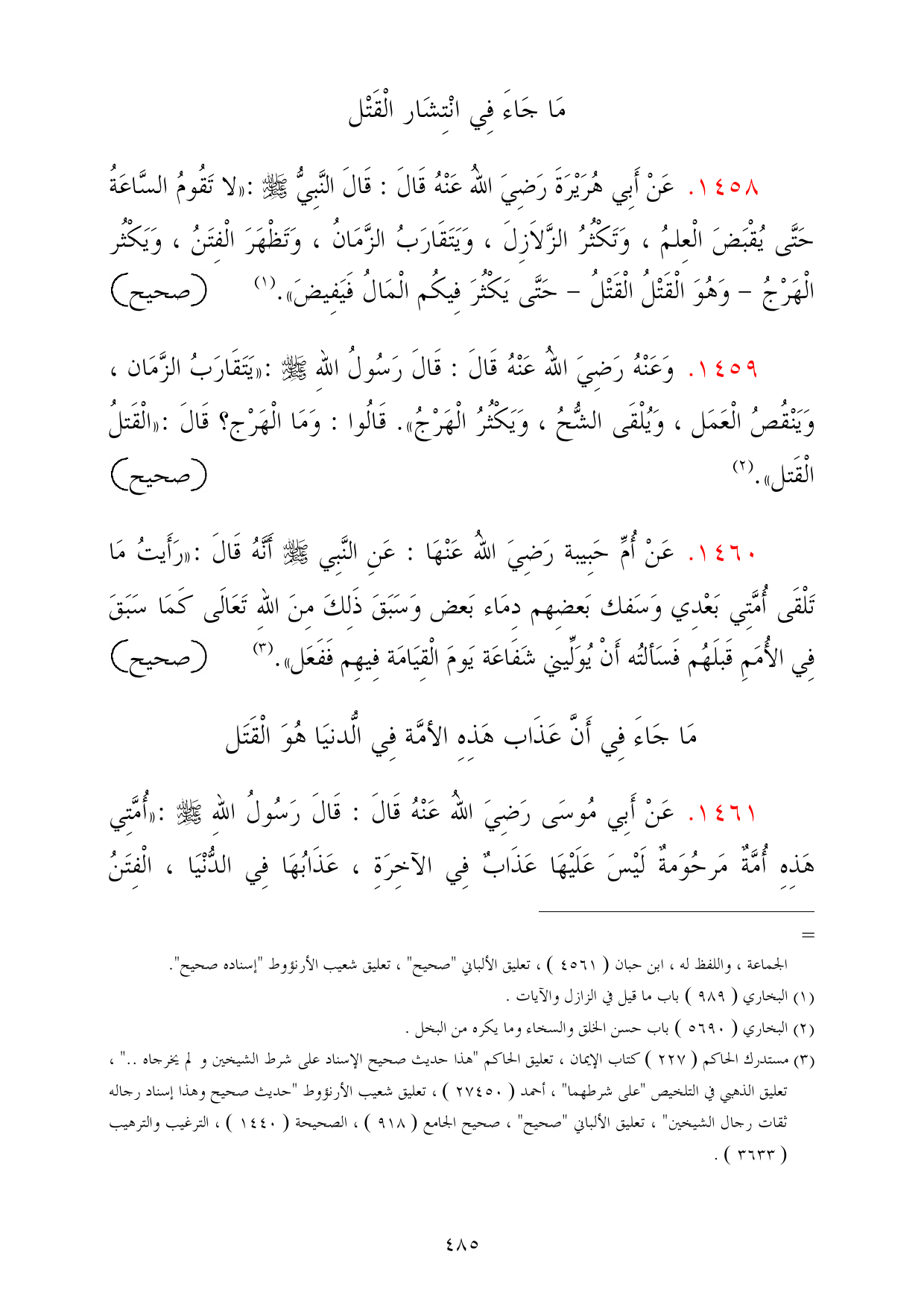 1461 - عَنْ أَبِي مُوسَى رَضِيَ اللهُ عَنْهُ قَالَ: قَالَ رَسُولُ اللهِ - صلى الله عليه وسلم -: «أُمَّتِي هَذِهِ أُمَّةٌ مَرحُوَمةٌ لَيْسَ عَلَيْهَا عَذَابٌ فِي الآخِرَةِ، عَذَابُهَا فِي الدُّنْيَا، الْفِتَنُ