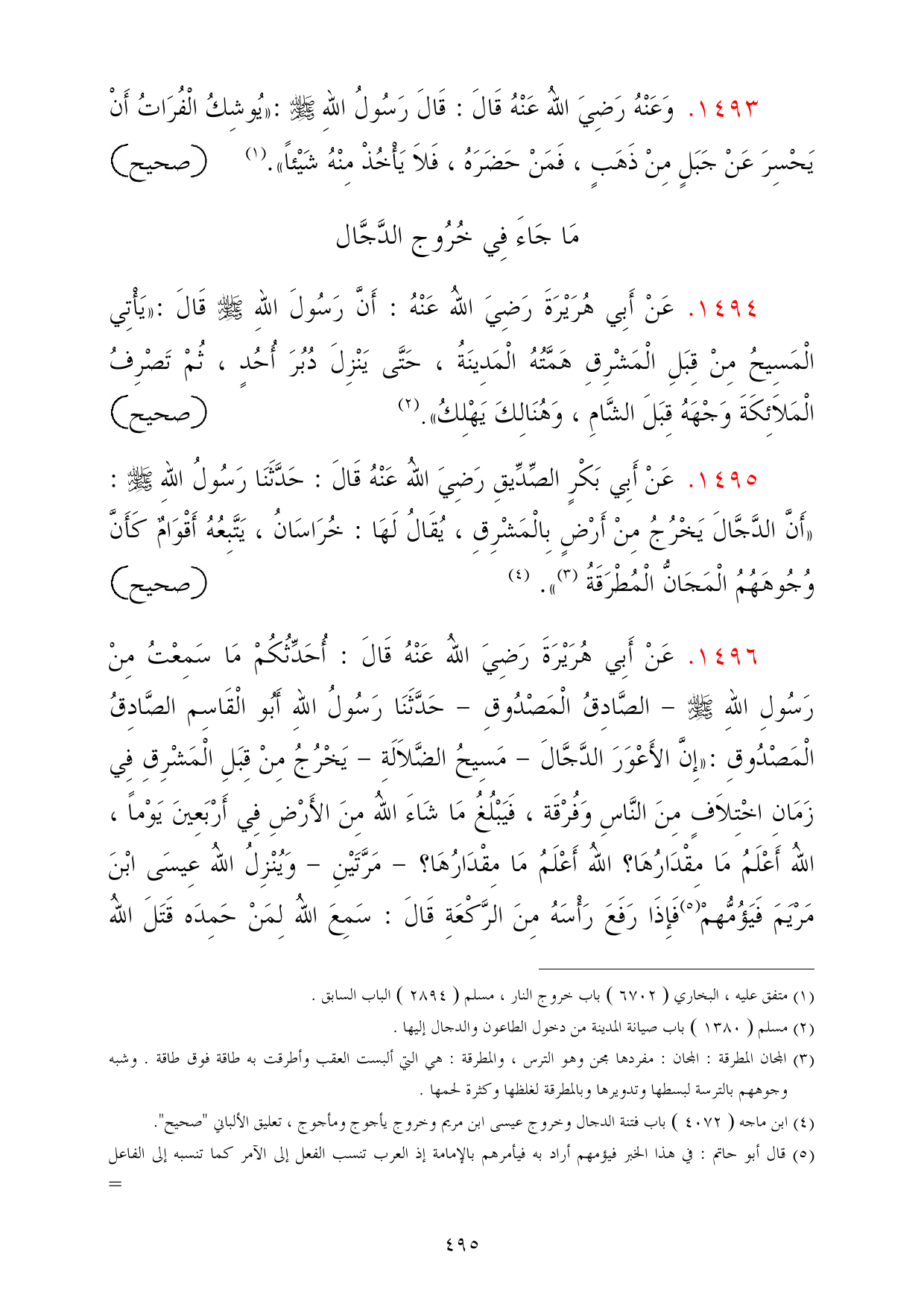 1496 - عَنْ أَبِي هُرَيْرَةَ رَضِيَ اللهُ عَنْهُ قَالَ: أُحَدِّثُكُمْ مَا سَمِعْتُ مِنْ رَسُولِ اللهِ - صلى الله عليه وسلم - الصَّادِقُ الْمَصْدُوقِ - حَدَّثَنَا رَسُولُ اللهِ أَبُو الْقَاسِم الصَّادِقُ الْمَصْدُوقِ: «إِنَّ الأَعْوَرَ الدَّجَّالَ - مَسِيحُ الضَّلاَلَةِ - يَخْرُجُ مِنْ قِبَلِ الْمَشْرِقِ فِي زَمَانِ اخْتِلاَفٍ مِنَ النَّاسِ وَفُرْقَة، فَيَبْلُغُ مَا شَاءَ اللهُ مِنَ الأَرْضِ فِي أَرْبَعِينَ يَوْماً، اللهُ أَعْلَمُ مَا مِقْدَارُهَا؟ اللهُ أَعْلَمُ مَا مِقْدَارُهَا؟ - مَرَّتَيْنِ - وَيُنْزِلُ اللهُ عِيسَى ابْنَ مَرْيَمَ فَيَؤُمُّهمْ (¬5) فَإِذَا رَفَعَ رَأْسَهُ مِنَ الرَّكْعَةِ قَالَ: سَمِعَ اللهُ لِمَنْ حَمِدَه قَتَلَ اللهُ