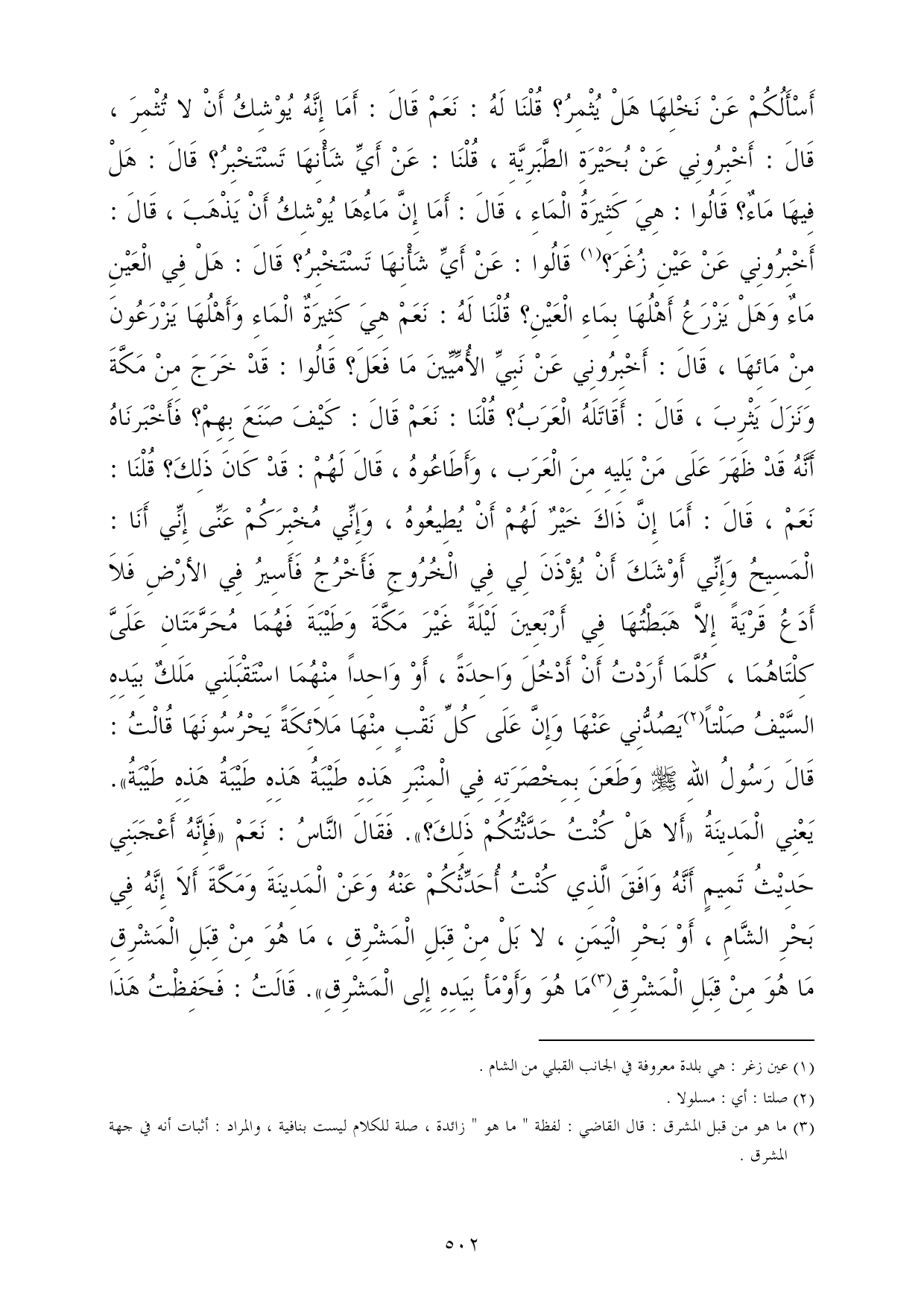 أَسْأَلُكُمْ عَنْ نَخْلِهَا هَلْ يُثْمِرُ؟ قُلْنَا لَهُ: نَعَمْ قَالَ: أَمَا إِنَّهُ يُوْشِكُ أَنْ لا تُثْمِرَ، قَالَ: أَخْبِرُونِي عَنْ بُحَيْرَةِ الطَّبَرِيَّةِ، قُلْنَا: عَنْ أَيِّ شَأْنِهَا تَسْتَخْبِرُ؟ قَالَ: هَلْ فِيهَا مَاءٌ؟ قَالُوا: هِيَ كَثِيرَةُ الْمَاءِ، قَالَ: أَمَا إِنَّ مَاءُهَا يُوْشِكُ أَنْ يَذْهَبَ، قَالَ: أَخْبِرُونِي عَنْ عَيْنِ زُغَرَ؟ (¬1) قَالُوا: عَنْ أَيِّ شَأْنِهَا تَسْتَخْبِرُ؟ قَالَ: هَلْ فِي الْعَيْنِ مَاءٌ وَهَلْ يَزْرَعُ أَهْلُهَا بِمَاءِ الْعَيْنِ؟ قُلْنَا لَهُ: نَعَمْ هِيَ كَثِيرَةٌ الْمَاءِ وَأَهْلُهَا يَزْرَعُونَ مِنْ مَائِهَا، قَالَ: أَخْبِرُونِي عَنْ نَبِيِّ الأُمِّيِّينَ مَا فَعَلَ؟ قَالُوا: قَدْ خَرَجَ مِنْ مَكَّةَ وَنَزَلَ يَثْرِبَ، قَالَ: أَقَاتَلَهُ الْعَرَبُ؟ قُلْنَا: نَعَمْ قَالَ: كَيْفَ صَنَعَ بِهِمْ؟ فَأَخْبَرنَاهُ أَنَّهُ قَدْ ظَهَرَ عَلَى مَنْ يَلِيهِ مِنَ الْعَرَب، وَأَطَاعُوهُ، قَالَ لَهُمْ: قَدْ كَانَ ذَلِكَ؟ قُلْنَا: نَعَمْ، قَالَ: أَمَا إِنَّ ذَاكَ خَيْرٌ لَهُمْ أَنْ يُطِيعُوهُ، وَإِنِّي مُخْبِرَكُمْ عَنِّى إِنِّي أَنَا: الْمَسِيحُ وَإِنِّي أَوْشَكَ أَنْ يُؤْذَنَ لِي فِي الْخُرُوجِ فَأَخْرُجُ فَأَسِيرُ فِي الأرْضِ فَلاَ أَدَعُ قَرْيَةً إِلاَّ هَبَطْتُهَا فِي أَرْبَعِينَ لَيْلَةً غَيْرَ مَكَّةَ وَطَيْبَةَ فَهُمَا مُحَرَّمَتَانِ عَلَىَّ كِلْتَاهُمَا، كُلَّمَا أَرَدْتُ أَنْ أَدْخُلَ وَاحِدَةً، أَوْ وَاحِداً مِنْهُمَا اسْتَقْبَلَنِي مَلَكٌ بِيَدِهِ السَّيْفُ صَلْتاً (¬2) يَصُدُّنِي عَنْهَا وَإِنَّ عَلَى كُلِّ نَقْبٍ مِنْهَا مَلاَئِكَةً يَحْرُسُونَهَا قُالْتُ: قَالَ رَسُولُ اللهِ - صلى الله عليه وسلم - وَطَعَنَ بِمِخْصَرَتِهِ فِي الْمِنْبَرِ هَذِهِ طَيْبَةُ هَذِهِ طَيْبَةُ هَذِهِ طَيْبَةُ». يَعْنِي الْمَدِينَةُ «أَلا هَلْ كُنْتُ حَدَّثْتُكُمْ ذَلِكَ؟». فَقَالَ النَّاسُ: نَعَمْ «فَإِنَّهُ أَعْجَبَنِي حَدِيْثُ تَمِيمٍ أَنَّهُ وَافَقَ الَّذِي كُنْتُ أُحَدِّثُكُمْ عَنْهُ وَعَنْ الْمَدِينَةَ وَمَكَّةَ أَلاَ إِنَّهُ فِي بَحْرِ الشَّامِ، أَوْ بَحْرِ الْيَمَنِ، لا بَلْ مِنْ قِبَلِ الْمَشْرِقِ، مَا هُوَ مِنْ قِبَلِ الْمَشْرِقِ مَا هُوَ مِنْ قِبَلِ الْمَشْرِقِ (¬3) مَا هُوَ وَأَوْمَأ بِيَدِهِ إِلِى الْمَشْرِقِ». قَالَتُ: فَحَفِظْتُ هَذَا