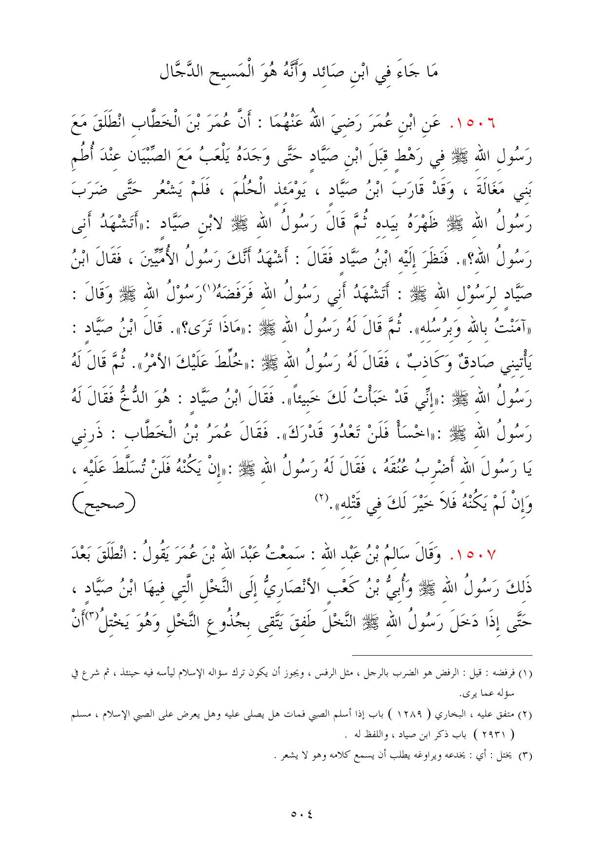 1506 - عَنِ ابْنِ عُمَرَ رَضِيَ اللهُ عَنْهُمَا: أَنَّ عُمَرَ بْنَ الْخَطَّابِ انْطَلَقَ مَعَ رَسُولِ اللهِ - صلى الله عليه وسلم - فِي رَهْطٍ قِبَلَ ابْنِ صَيَّادٍ حَتَّى وَجَدَهُ يَلْعَبُ مَعَ الصِّبْيَان عِنْدَ أُطُمِ بَنِي مَغَالَةَ، وَقَدْ قَارَبَ ابْنُ صَيَّادٍ، يَوْمَئِذٍ الْحُلُمَ، فَلَمْ يَشْعُر حَتَّى ضَرَبَ رَسُولُ اللهِ - صلى الله عليه وسلم - ظَهْرَهُ بِيَدِهِ ثُمَّ قَالَ رَسُولُ اللهِ - صلى الله عليه وسلم - لابْنِ صَيَّادٍ: «أَتَشْهَدُ أَنِى رَسُولُ اللهِ؟». فَنَظَرَ إِلَيْهِ ابْنُ صَيَّادٍ فَقَالَ: أَشْهَدُ أَنَّكَ رَسُولُ الأُمِّيِّينَ، فَقَالَ ابْنُ صَيَّادٍ لِرَسُوْلِ اللهِ - صلى الله عليه وسلم -: أَتَشْهَدُ أَنِي رَسُولُ اللهِ فَرَفَضَهُ (¬1) رَسُوْلُ اللهِ - صلى الله عليه وسلم - وَقَالَ: «آمَنْتُ بِاللهِ وَبِرُسُلِهِ». ثُمَّ قَالَ لَهُ رَسُولُ اللهِ - صلى الله عليه وسلم -: «مَاذَا تَرَى؟». قَالَ ابْنُ صَيَّادٍ: يَأْتِينِي صَادِقٌ وَكَاذِبٌ، فَقَالَ لَهُ رَسُولُ اللهِ - صلى الله عليه وسلم -: «خُلِّطَ عَلَيْكَ الأمْرُ». ثُمَّ قَالَ لَهُ رَسُولُ اللهِ - صلى الله عليه وسلم -: «إِنِّي قَدْ خَبَأْتُ لَكَ خَبِيئاً». فَقَالَ ابْنُ صَيَّادٍ: هُوَ الدُّخُّ فَقَالَ لَهُ رَسُولُ اللهِ - صلى الله عليه وسلم -: «اخْسَأْ فَلَنْ تَعْدُوَ قَدْرَكَ». فَقَالَ عُمَرُ بْنُ الْخَطَّابِ: ذَرنِي يَا رَسُولَ اللهِ أَضْرِبُ عُنُقَهُ، فَقَالَ لَهُ رَسُولُ اللهِ - صلى الله عليه وسلم -: «إِنْ يَكُنْهُ فَلَنْ تُسَلَّطَ عَلَيْهِ، وَإِنْ لَمْ يَكُنْهُ فَلاَ خَيْرَ لَكَ فِي قَتْلِهِ». (¬2) =صحيح