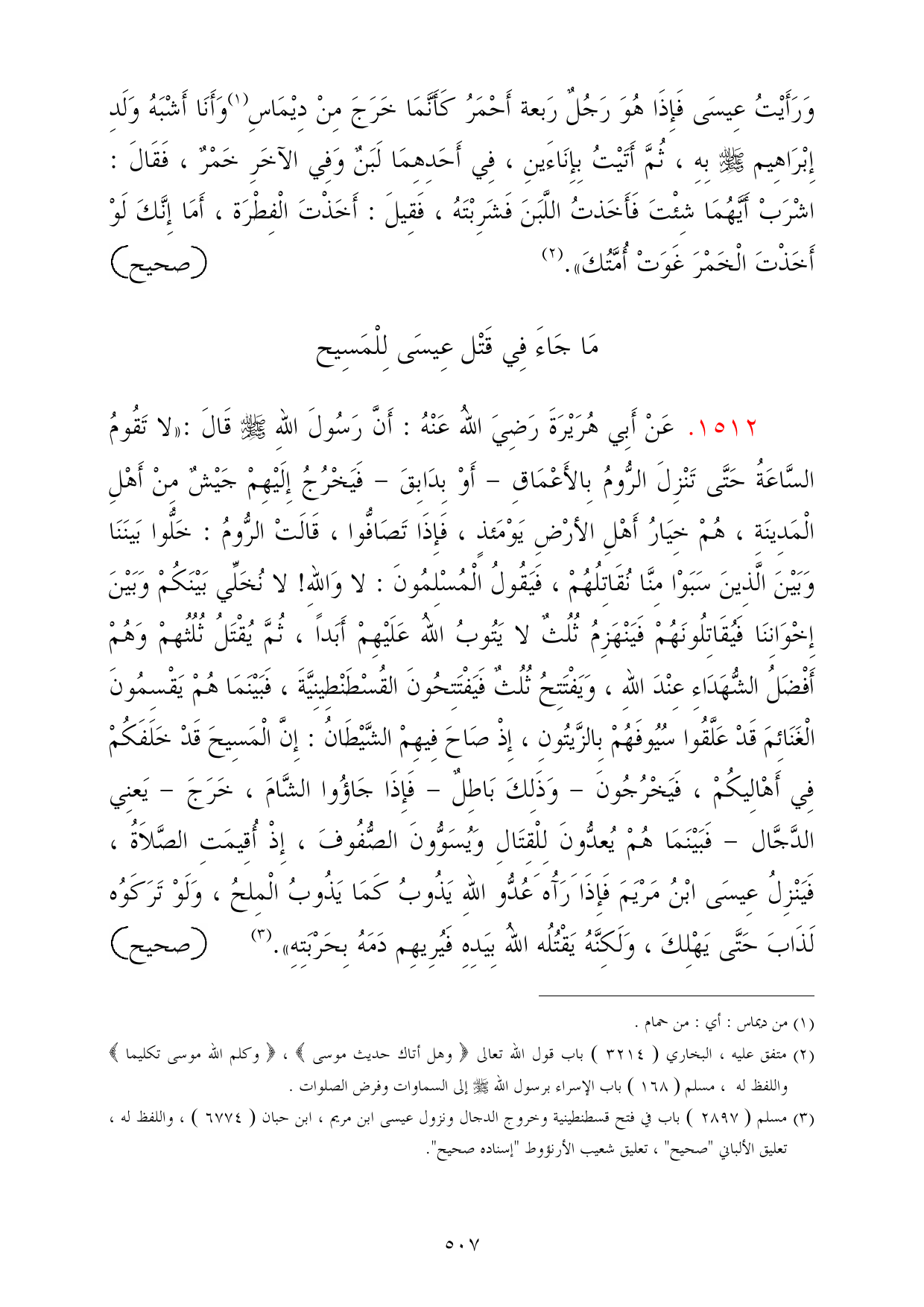 (¬3) مسلم (2897) باب في فتح قسطنطينية وخروج الدجال ونزول عيسى ابن مريم، ابن حبان (6774)، واللفظ له، تعليق الألباني "صحيح"، تعليق شعيب الأرنؤوط "إسناده صحيح".