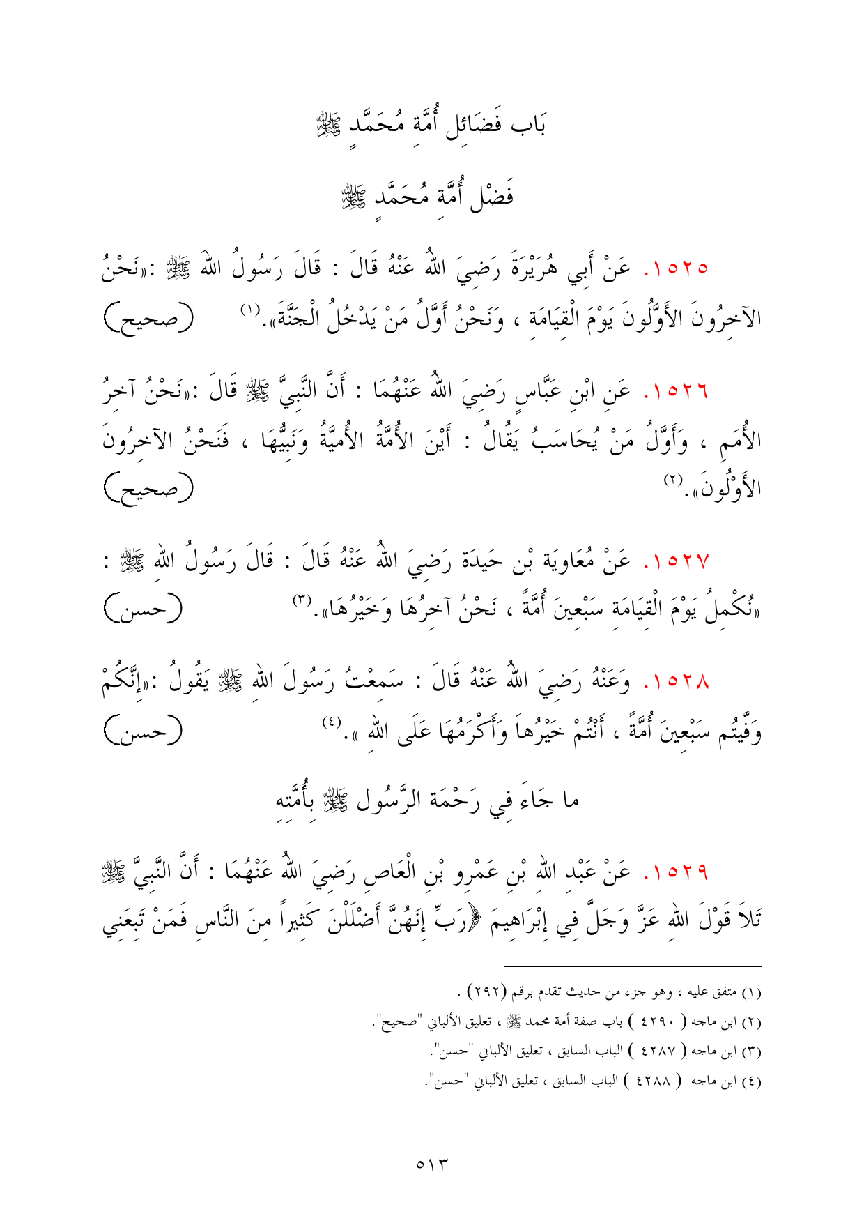 1526 - عَنِ ابْنِ عَبَّاسٍ رَضِيَ اللهُ عَنْهُمَا: أَنَّ النَّبِيَّ - صلى الله عليه وسلم - قَالَ: «نَحْنُ آخِرُ الأُمَمِ، وَأَوَّلُ مَنْ يُحَاسَبُ يَقُالُ: أَيْنَ الأُمَّةُ الأُميَّةُ وَنَبِيُّهَا، فَنَحْنُ الآخِرُونَ الأَوْلُونَ». (¬2) =صحيح