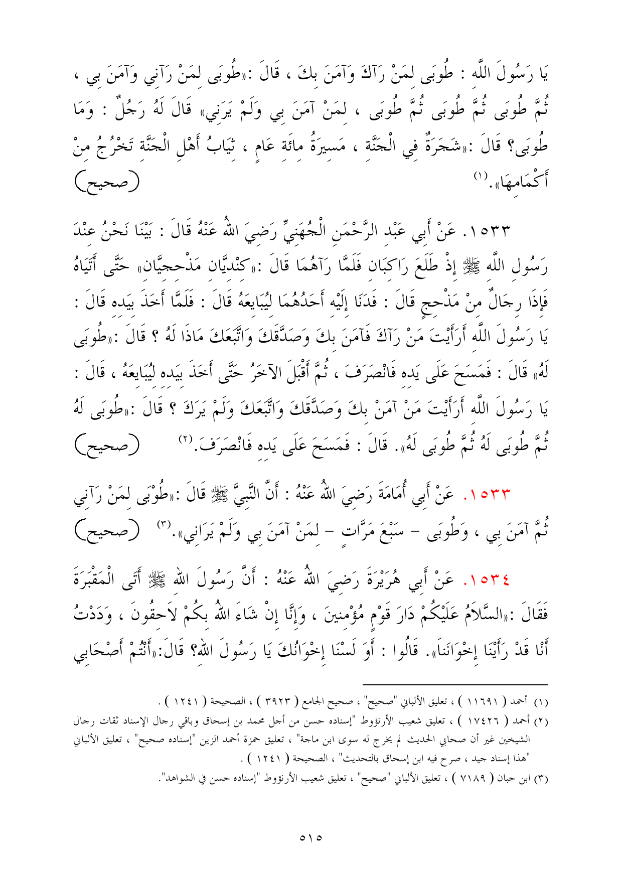 1533 - عَنْ أَبِي أُمَامَةَ رَضِيَ اللهُ عَنْهُ: أَنَّ النَّبِيَّ - صلى الله عليه وسلم - قَالَ: «طُوْبَى لِمَنْ رَآنِي ثُمَّ آمَنَ بِي، وَطُوبَى - سَبْعَ مَرَّاتٍ - لِمَنْ آمَنَ بِي وَلَمْ يَرَانِي». (¬3) =صحيح