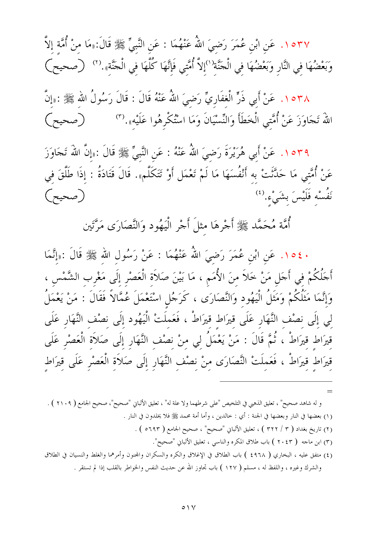 1540 - عَنِ ابْنِ عُمَرَ رَضِيَ اللهُ عَنْهُمَا: عَنْ رَسُولِ اللهِ - صلى الله عليه وسلم - قَالَ: «إِنَّمَا أَجَلُكُمْ فِي أَجَلِ مَنْ خَلاَ مِنَ الأُمَمِ، مَا بَيْنَ صَلاَةِ الْعَصْرِ إِلَى مَغْرِبِ الشَّمْسِ، وَإِنَّمَا مَثَلُكُمْ وَمَثَلُ الْيَهُودِ وَالنَّصَارَى، كَرَجُلٍ اسْتَعْمَلَ عُمَّالاً فَقَالَ: مَنْ يَعْمَلُ لِي إِلَى نِصْفِ النَّهَارِ عَلَى قِيرَاطٍ قِيرَاطْ، فَعَمِلَتْ الْيَهُود إِلَى نِصْفِ النَّهَارِ عَلَى قِيرَاطٍ قِيرَاطْ، ثُمَّ قَالَ: مَنْ يَعْمَلُ لِي مِنْ نِصْفِ النَّهَارِ إِلَى صَلاَةِ الْعَصْرِ عَلَى قِيرَاطٍ قِيرَاطْ، فَعَمِلَتْ النَّصَارَى مِنْ نِصْفِ النَّهَارِ إِلَى صَلاَةِ الْعَصْرِ عَلَى قِيرَاطٍ