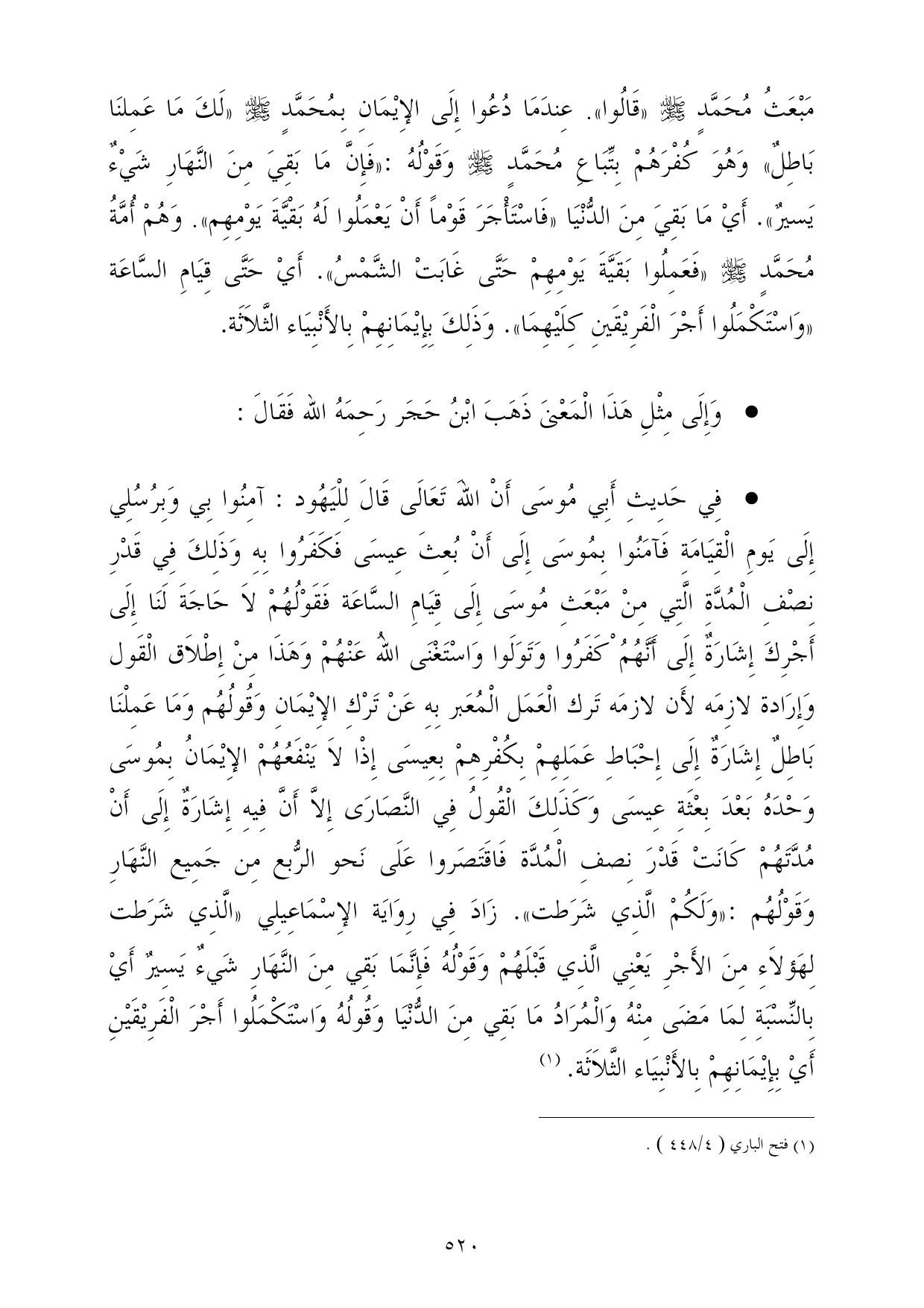 * فِي حَدِيثِ أَبِي مُوسَى أَنْ اللهَ تَعَالَى قَالَ لِلْيَهُود: آمِنُوا بِي وَبِرُسُلِي إِلَى يَومِ الْقِيَامَةِ فَآمَنُوا بِمُوسَى إِلَى أَنْ بُعِثَ عِيسَى فَكَفَرُوا بِهِ وَذَلِكَ فِي قَدْرِ نِصْفِ الْمُدَّةِ الَّتِي مِنْ مَبْعَثِ مُوسَى إِلَى قِيَامِ السَّاعَة فَقَوْلُهُمْ لاَ حَاجَةَ لَنَا إِلَى أَجْرِكَ إِشَارَةٌ إِلَى أَنَّهُمُ ْكَفَرُوا وَتَوَلَوا وَاسْتَغْنَى اللهُ عَنْهُمْ وَهَذَا مِنْ إِطْلاَق الْقَول وَإِرَادة لازِمَه لأَن لازمَه تَرك الْعَمَل الْمُعَبر بِهِ عَنْ تَرْكِ الإِيْمَانِ وَقُولُهُم وَمَا عَمِلْنَا بَاطِلٌ إِشَارَةٌ إِلَى إِحْبَاطِ عَمَلِهِمْ بِكُفْرِهِمْ بِعِيسَى إِذْا لاَ يَنْفَعُهُمْ الإِيْمَانُ بِمُوسَى وَحْدَهُ بَعْدَ بِعْثَةِ عِيسَى وَكَذَلِكَ الْقُولُ فِي النَّصَارَى إِلاَّ أَنَّ فِيهِ إِشَارَةٌ إِلَى أَنْ مُدَّتَهُمْ كَانَتْ قَدْرَ نِصفِ الْمُدَّة فَاقَتَصَروا عَلَى نَحو الرُّبع مِن جَمِيع النَّهَارِ وَقَوْلُهُم: «وَلَكُمْ الَّذِي شَرَطت». زَادَ فِي رِوَايَة الإِسْمَاعِيلِي «الَّذِي شَرَطت لِهَؤلاَءِ مِنَ الأَجْرِ يَعْنِي الَّذِي قَبْلَهُمْ وَقَوْلُهُ فَإِنَّمَا بَقِي مِنَ النَّهَارِ شَيءٌ يَسِيرٌ أَيْ بِالنِّسْبَةِ لِمَا مَضَى مِنْهُ وَالْمُرَادُ مَا بَقِي مِنَ الدُّنْيَا وَقُولُهُ وَاسْتَكْمَلُوا أَجْرَ الْفَرِيْقَيْنِ أَيْ بِإِيْمَانِهِمْ بِالأَنْبِيَاء الثَّلاَثَة. (¬1)