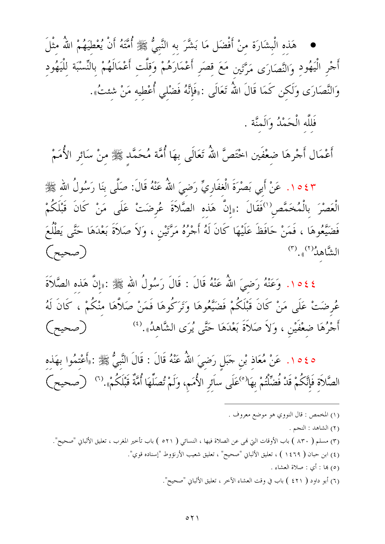 1545 - عَنْ مُعَاذِ بْنِ جَبَلٍ رَضِيَ اللهُ عَنْهُ قَالَ: قَالَ النَّبِيُّ - صلى الله عليه وسلم -: «أَعْتِمُوا بِهَذِهِ الصَّلاَةِ فَإِنَّكُمْ قَدْ فُضِّلْتُمْ بِهَا (¬5) عَلَى ساَئِرِ الأُمَمِ، وَلَمْ تُصَلِّهَا أُمَّةٌ قَبْلَكُمْ». (¬6) =صحيح
