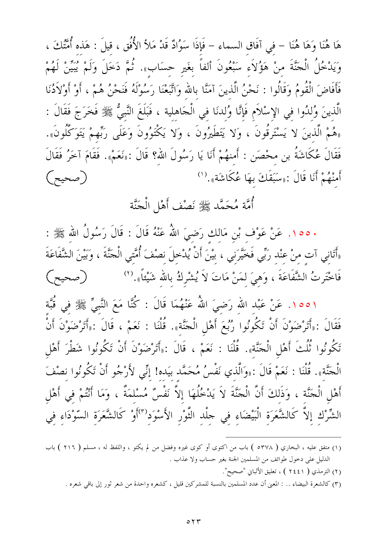 1551 - عَنْ عَبْدِ اللهِ رَضِيَ اللهُ عَنْهُمَا قَالَ: كُنَّا مَعَ النَّبِيِّ - صلى الله عليه وسلم - فِي قُبَّةٍ فَقَالَ: «أَتَرْضَوْنَ أَنْ تَكُونُوا رُبُعَ أَهْلِ الْجَنَّةِ». قُلْنَا: نَعَمْ، قَالَ: «أَتَرْضَوْنَ أَنْ تَكُونُوا ثُلُثَ أَهْلِ الْجَنَّةِ». قُلْنَا: نَعَمْ، قَالَ: «أَتَرْضَوْنَ أَنْ تَكُونُوا شَطْرَ أَهْلِ الْجَنَّةِ». قُلْنَا: نَعَمْ قَالَ: «وَالَّذِي نَفْسُ مُحَمَّدٍ بِيَدِهِ! إِنِّي لأَرْجُو أَنْ تَكُونُوا نِصْفَ أَهْلِ الْجَنَّةِ، وَذَلِكَ أَنَّ الْجَنَّةَ لاَ يَدْخُلُهَا إِلاَّ نَفْسٌ مُسْلِمَةٌ، وَمَا أَنْتُمْ فِي أَهْلِ الشِّرْكِ إِلاَّ كَالشَّعَرَةِ الْبَيْضَاءِ فِي جِلْدِ الثَّوْرِ الأَسْوَدِ (¬3) أَوْ كَالشَّعَرَةِ السّوْدَاءِ فِي