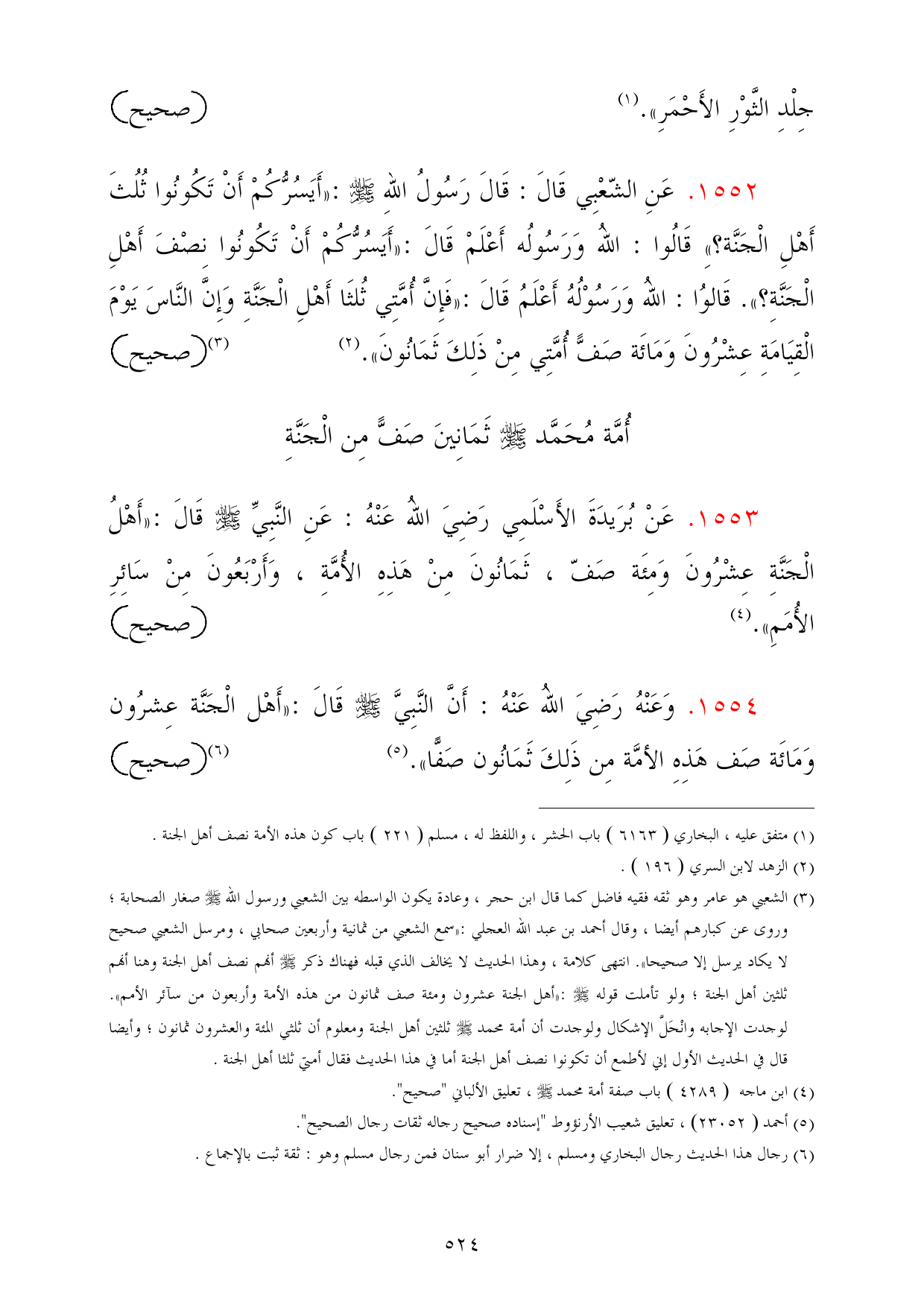 1553 - عَنْ بُرَيدَةَ الأَسْلَمِي رَضِيَ اللهُ عَنْهُ: عَنِ النَّبِيِّ - صلى الله عليه وسلم - قَالَ: «أَهْلُ الْجَنَّةِ عِشْرُونَ وَمِئَة صَفّ، ثَمَانُونَ مِنْ هَذِهِ الأُمَّةِ، وَأَرْبَعُونَ مِنْ سَائِرِ الأُمَمِ». (¬4) =صحيح