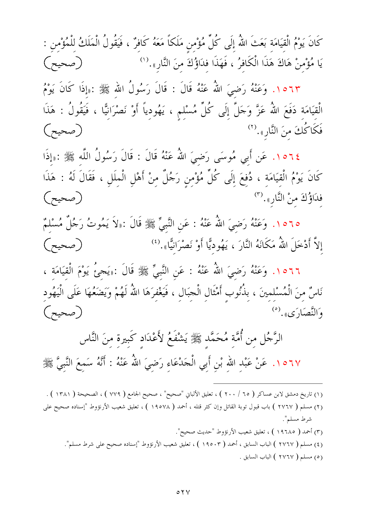 1564 - عَن أَبِي مُوسَى رَضِيَ اللهُ عَنْهُ قَالَ: قَالَ رَسُولُ اللَّهِ - صلى الله عليه وسلم -: «إِذَا كَانَ يَوْمُ الْقِيَامَةِ، دُفِعَ إِلَى كُلِّ مُؤْمِنٍ رَجُلٌ مِنْ أَهْلِ الْمِلَلِ، فَقَالَ لَهُ: هَذَا فِدَاؤُكَ مِنْ النَّارِ». (¬3) =صحيح
