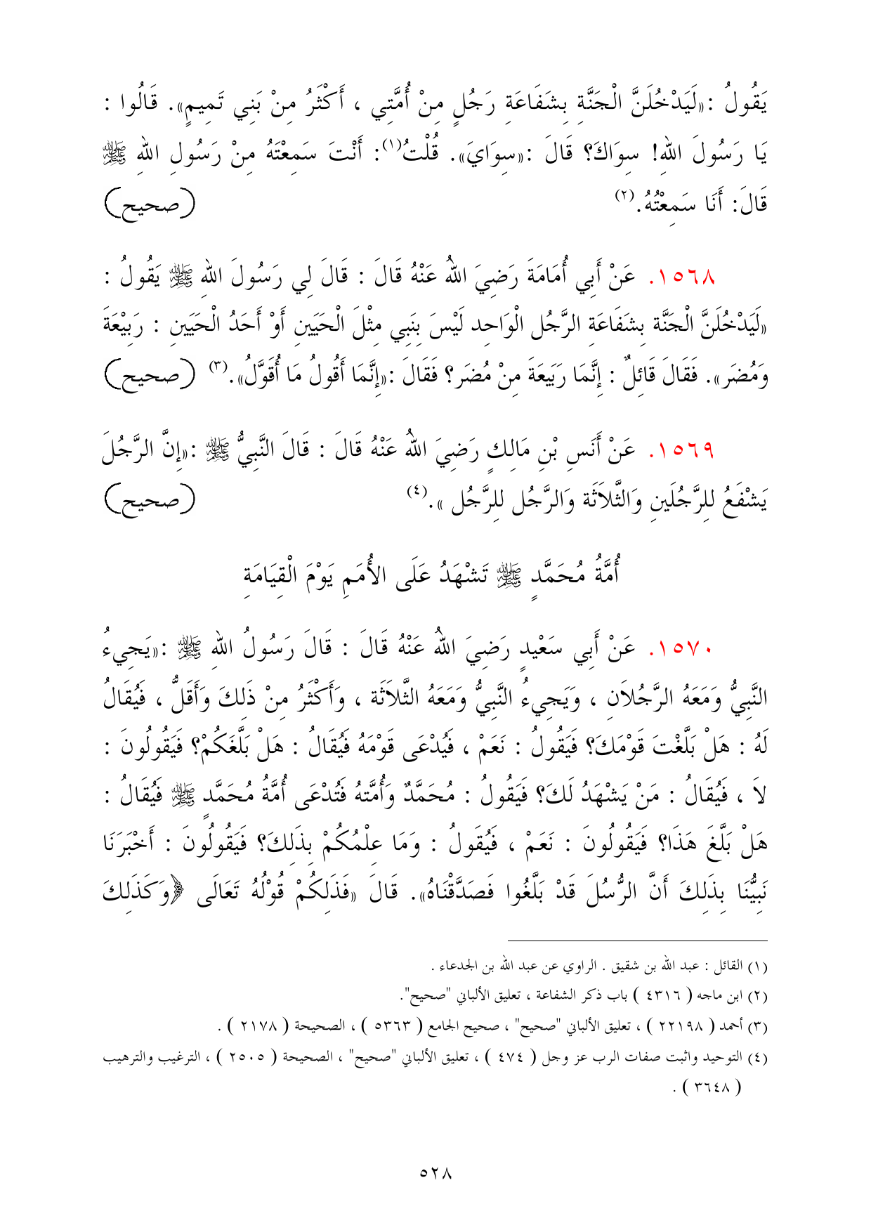 1569 - عَنْ أَنَسِ بْنِ مَالِكٍ رَضِيَ اللهُ عَنْهُ قَالَ: قَالَ النَّبِيُّ - صلى الله عليه وسلم -: «إِنَّ الرَّجُلَ يَشْفَعُ للِرَّجُلَينِ وَالثَّلاَثَة وَالرَّجُل للِرَّجُل». (¬4) =صحيح