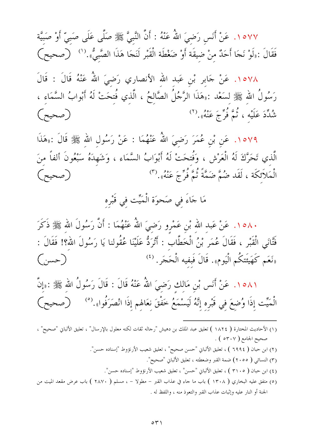 1581 - عَنْ أَنَس بْنِ مَالِكٍ رَضِيَ اللهُ عَنْهُ قَالَ: قَالَ رَسُولُ اللهِ - صلى الله عليه وسلم -: «إِنَّ الْمَيِّت إِذَا وُضِعَ فِي قَبْرِهِ إِنَّهُ لَيَسْمَعُ خَفْقَ نِعَالهِم إِذَا انْصَرَفُوا». (¬5) =صحيح