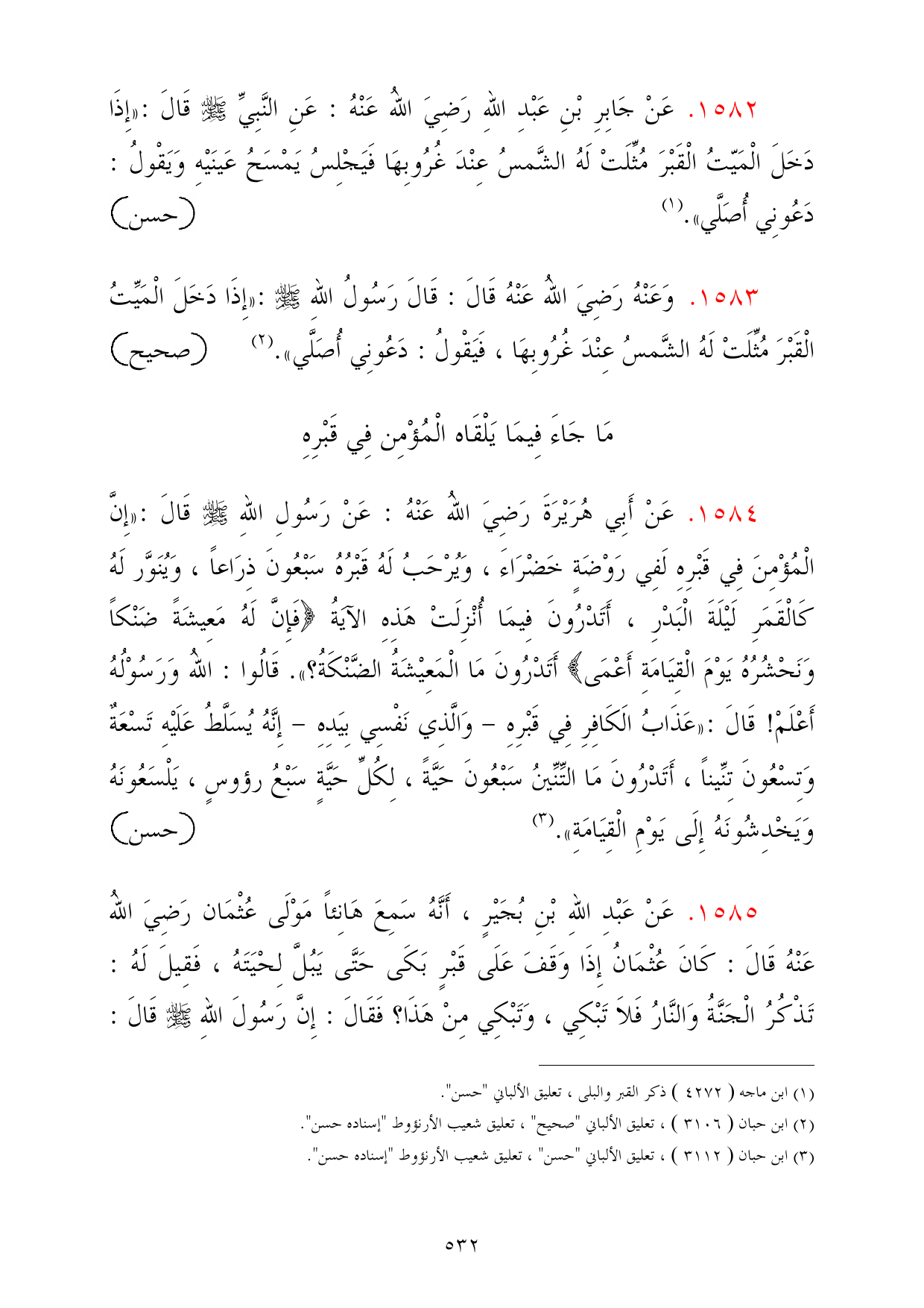 1582 - عَنْ جَابِرِ بْنِ عَبْدِ اللهِ رَضِيَ اللهُ عَنْهُ: عَنِ النَّبِيِّ - صلى الله عليه وسلم - قَالَ: «إِذَا دَخَلَ الْمَيّتُ الْقَبْرَ مُثِّلَتْ لَهُ الشَّمسُ عِنْدَ غُرُوبِهَا فَيَجْلِسُ يَمْسَحُ عَينَيْهِ وَيَقْولُ: دَعُونِي أُصَلَّي». (¬1) =حسن