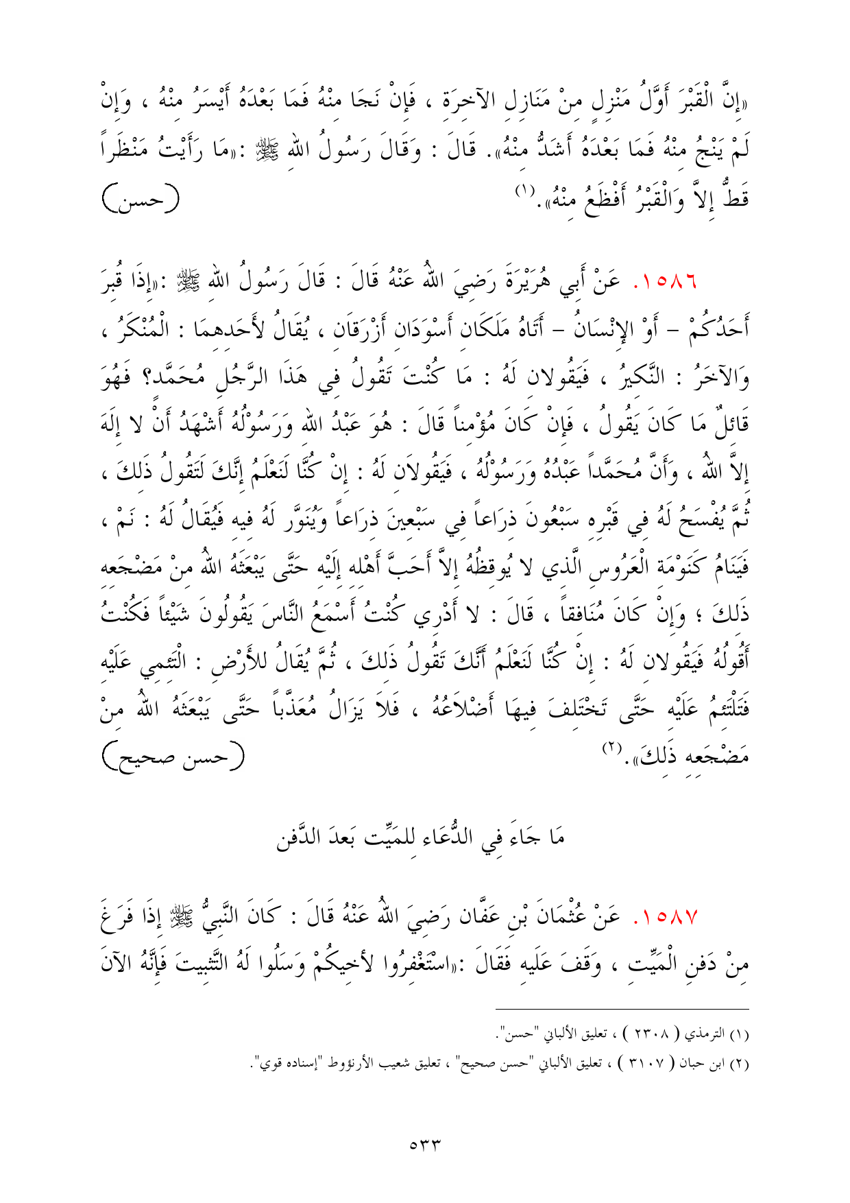 1587 - عَنْ عُثْمَانَ بْنِ عَفَّان رَضِيَ اللهُ عَنْهُ قَالَ: كَانَ النَّبِيُّ - صلى الله عليه وسلم - إِذَا فَرَغَ مِنْ دَفنِ الْمَيِّتِ، وَقَفَ عَلَيهِ فَقَالَ: «اسْتَغْفِرُوا لأخِيكُمْ وَسَلُوا لَهُ التَّثبِيتَ فَإِنَّهُ الآنَ