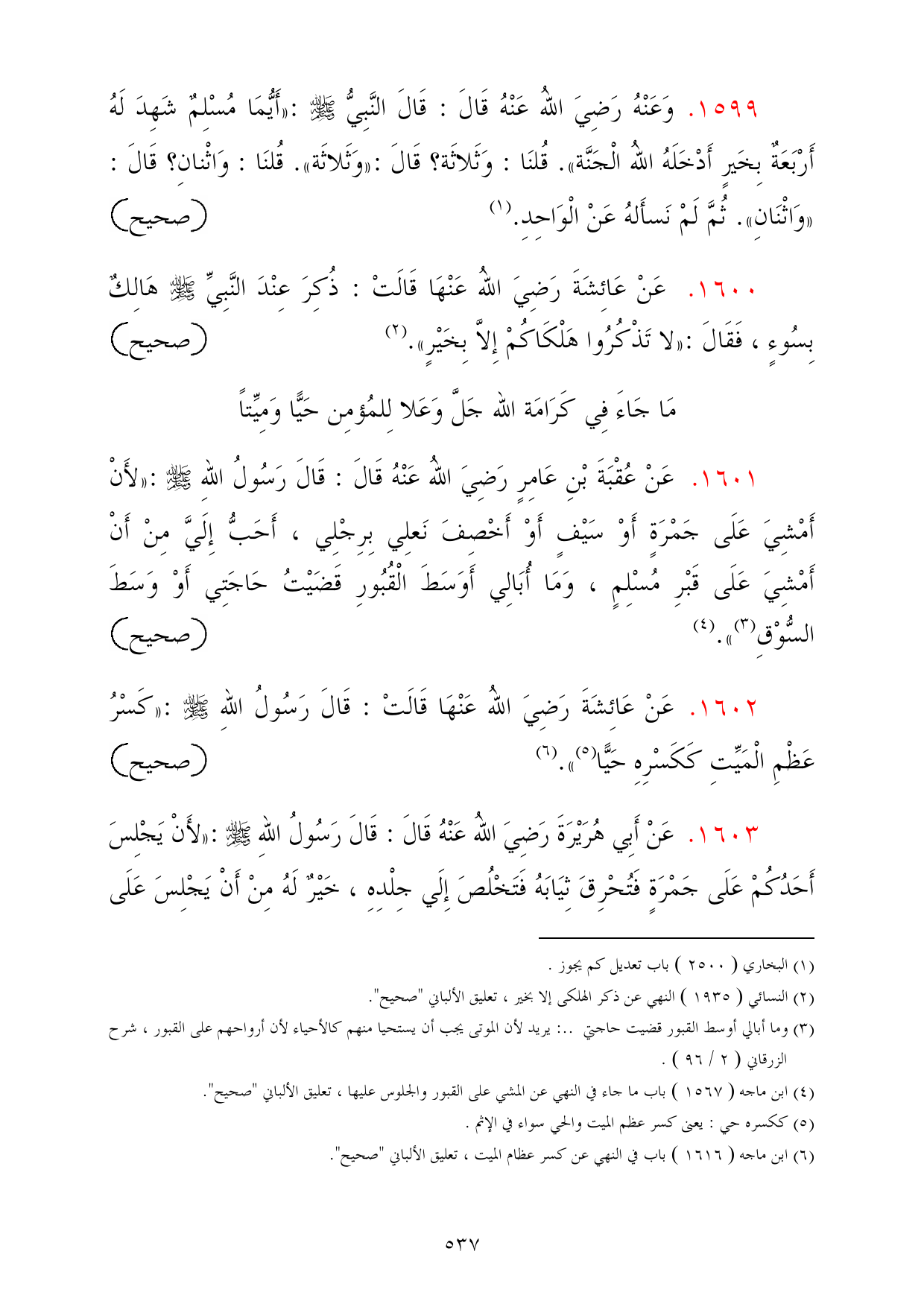 (¬4) ابن ماجه (1567) باب ما جاء في النهي عن المشي على القبور والجلوس عليها، تعليق الألباني "صحيح".