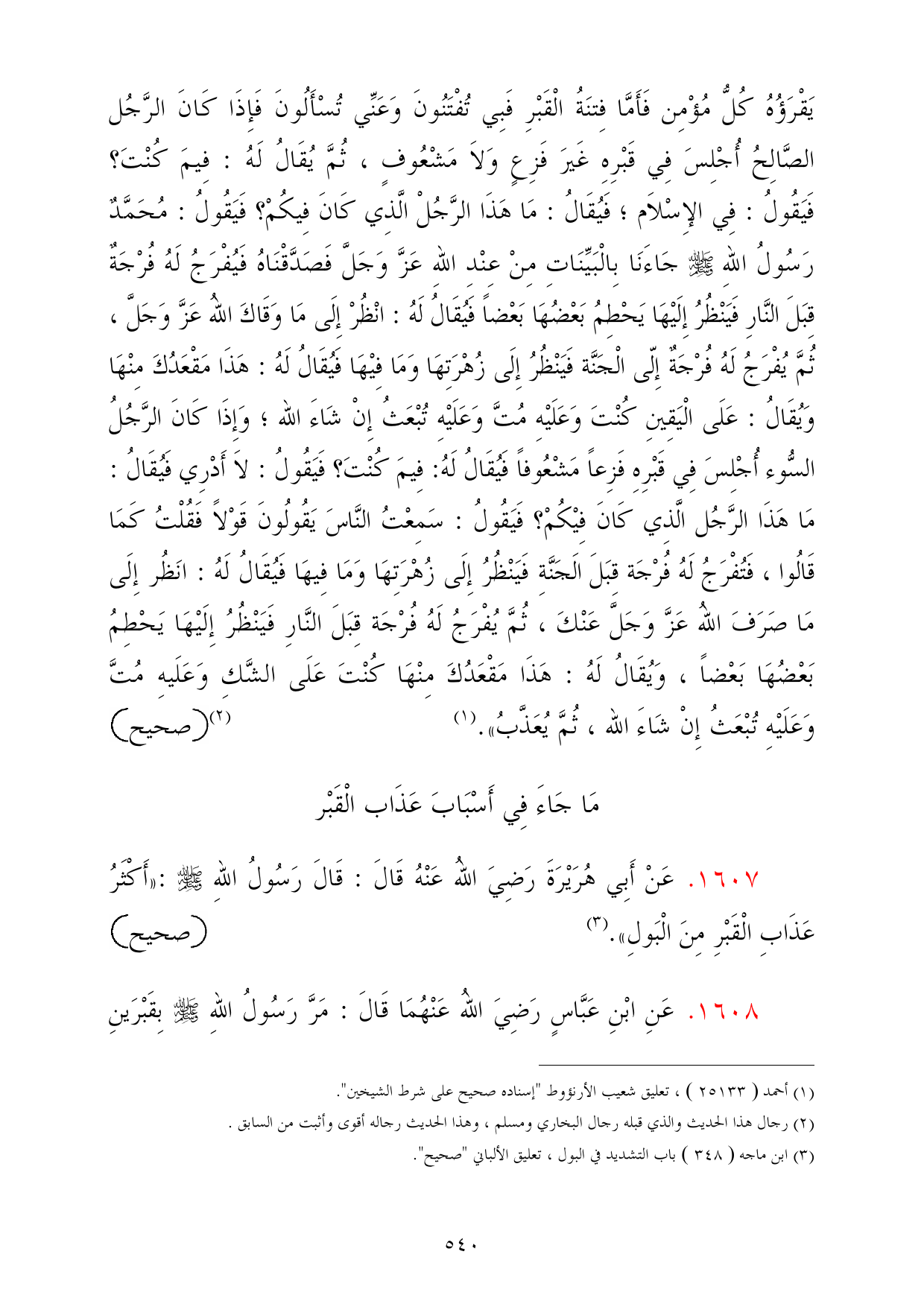 1607 - عَنْ أَبِي هُرَيْرَةَ رَضِيَ اللهُ عَنْهُ قَالَ: قَالَ رَسُولُ اللهِ - صلى الله عليه وسلم -: «أَكْثَرُ عَذَابِ الْقَبْرِ مِنَ الْبَولِ». (¬3) =صحيح