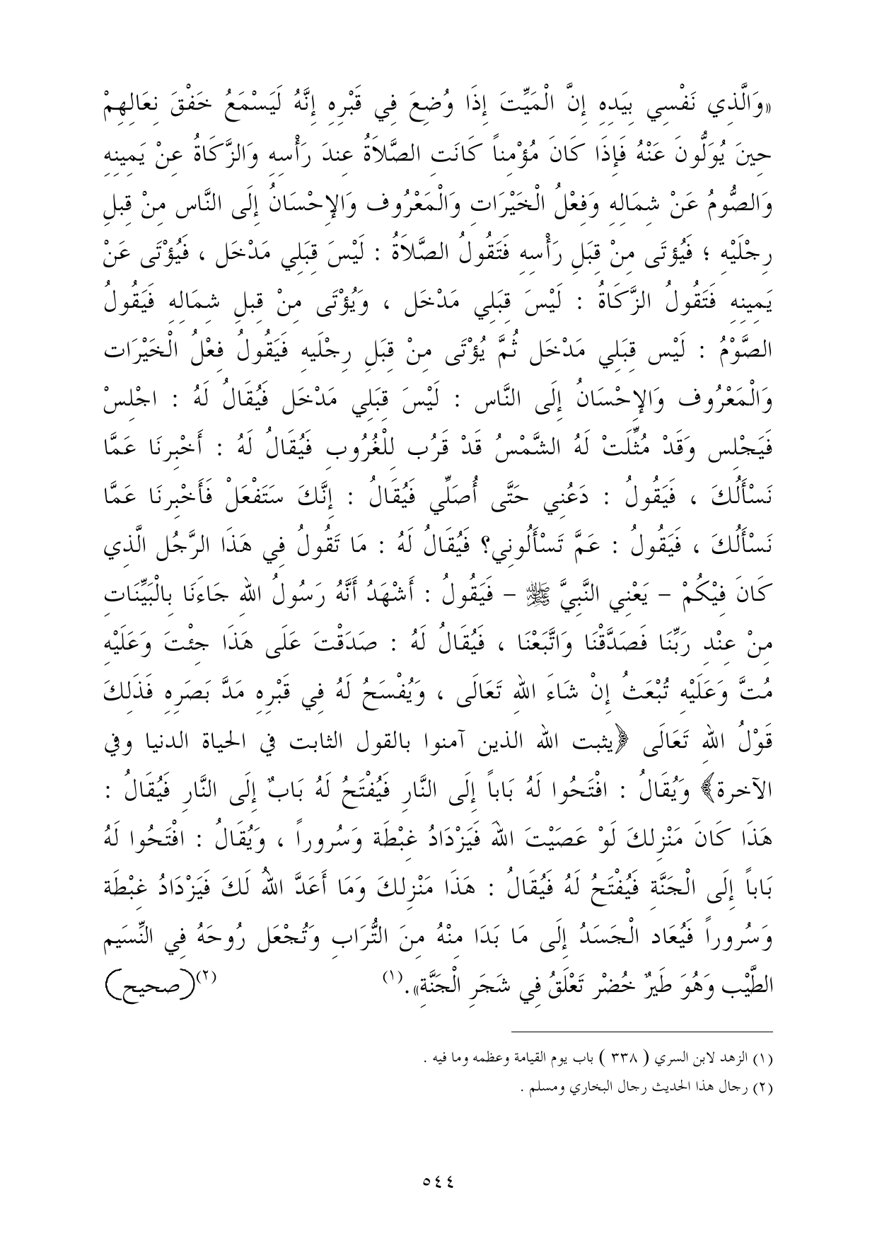 «وَالَّذِي نَفْسِي بِيَدِهِ إِنَّ الْمَيِّتَ إِذَا وُضِعَ فِي قَبْرِهِ إِنَّهُ لَيَسْمَعُ خَفْقَ نِعَالِهِمْ حِينَ يُوَلُّونَ عَنْهُ فَإِذَا كَانَ مُؤْمِناً كَانَتِ الصَّلاَةُ عِندَ رَأْسِهِ وَالزَّكَاةُ عِنْ يَمِينِهِ وَالصُّومُ عَنْ شِمَالِهِ وَفِعْلُ الْخَيْرَاتِ وَالْمَعْرُوف وَالإِحْسَانُ إِلَى النَّاس مِنْ قِبلِ رِجْلَيْهِ؛ فَيُؤتَى مِنْ قِبَلِ رَأْسِهِ فَتَقُولُ الصَّلاَةُ: لَيْسَ قِبَلِي مَدْخَل، فَيُؤْتَى عَنْ يَمِينِهِ فَتَقُولُ الزَّكَاةُ: لَيْسَ قِبَلِي مَدْخَل، وَيُؤْتَى مِنْ قِبلِ شِمَالِهِ فَيَقُولُ الصَّوْمُ: لَيْس قِبَلِي مَدْخَل ثُمَّ يُؤْتَى مِنْ قِبَلِ رِجْلَيهِ فَيَقُولُ فِعْلُ الْخَيْرَات وَالْمَعْرُوف وَالإِحْسَانُ إِلَى النَّاس: لَيْسَ قِبَلِي مَدْخَل فَيُقَالُ لَهُ: اجْلِسْ فَيَجْلِس وَقَدْ مُثِّلَتْ لَهُ الشَّمْسُ قَدْ قَرُب لِلْغُرُوبِ فَيُقَالُ لَهُ: أَخْبِرنَا عَمَّا نَسْأَلُكَ، فَيَقُولُ: دَعُنِي حَتَّى أُصَلِّي فَيُقَالُ: إِنَّكَ سَتَفْعَلْ فَأَخْبِرنَا عَمَّا نَسْأَلُكَ، فَيَقُولُ: عَمَّ تَسْأَلُونِي؟ فَيُقَالُ لَهُ: مَا تَقُولُ فِي هَذَا الرَّجُل الَّذِي كَانَ فِيْكُمْ - يَعْنِي النَّبِيَّ - صلى الله عليه وسلم - فَيَقُولُ: أَشْهَدُ أَنَّهُ رَسُولُ اللهِ جَاءَنَا بِالْبَيِّنَاتِ مِنْ عِنْدِ رَبِّنَا فَصَدَّقْنَا وَاتَّبَعْنَا، فَيُقَالُ لَهُ: صَدَقْتَ عَلَى هَذَا جِئْتَ وَعَلَيْهِ مُتَّ وَعَلَيْهِ تُبْعَثُ إِنْ شَاءَ اللهِ تَعَالَى، وَيُفْسَحُ لَهُ فِي قَبْرِهِ مَدَّ بَصَرِهِ فَذَلِكَ قَوْلُ اللهِ تَعَالَى {يثبت الله الذين آمنوا بالقول الثابت في الحياة الدنيا وفي الآخرة} وَيُقَالُ: افْتَحُوا لَهُ بَاباً إِلَى النَّارِ فَيُفْتَحُ لَهُ بَابٌ إِلَى النَّارِ فَيُقَالُ: هَذَا كَانَ مَنْزِلكَ لَوْ عَصَيْتَ اللهَ فَيَزْدَادُ غِبْطَة وَسُروراً، وَيُقَالُ: افْتَحُوا لَهُ بَاباً إِلَى الْجَنَّةِ فَيُفْتَحُ لَهُ فَيُقَالُ: هَذَا مَنْزِلكَ وَمَا أَعَدَّ اللهُ لَكَ فَيَزْدَادُ غِبْطَة وَسُروراً فَيُعَاد الْجَسَدُ إِلَى مَا بَدَا مِنْهُ مِنَ التُّرَابِ وَتُجْعَل رُوحَهُ فِي النِّسَيم الطَّيْب وَهُوَ طَيرٌ خُضْر تَعْلَقُ فِي شَجَرِ الْجَنَّةِ». (¬1) ... (¬2) *صحيح