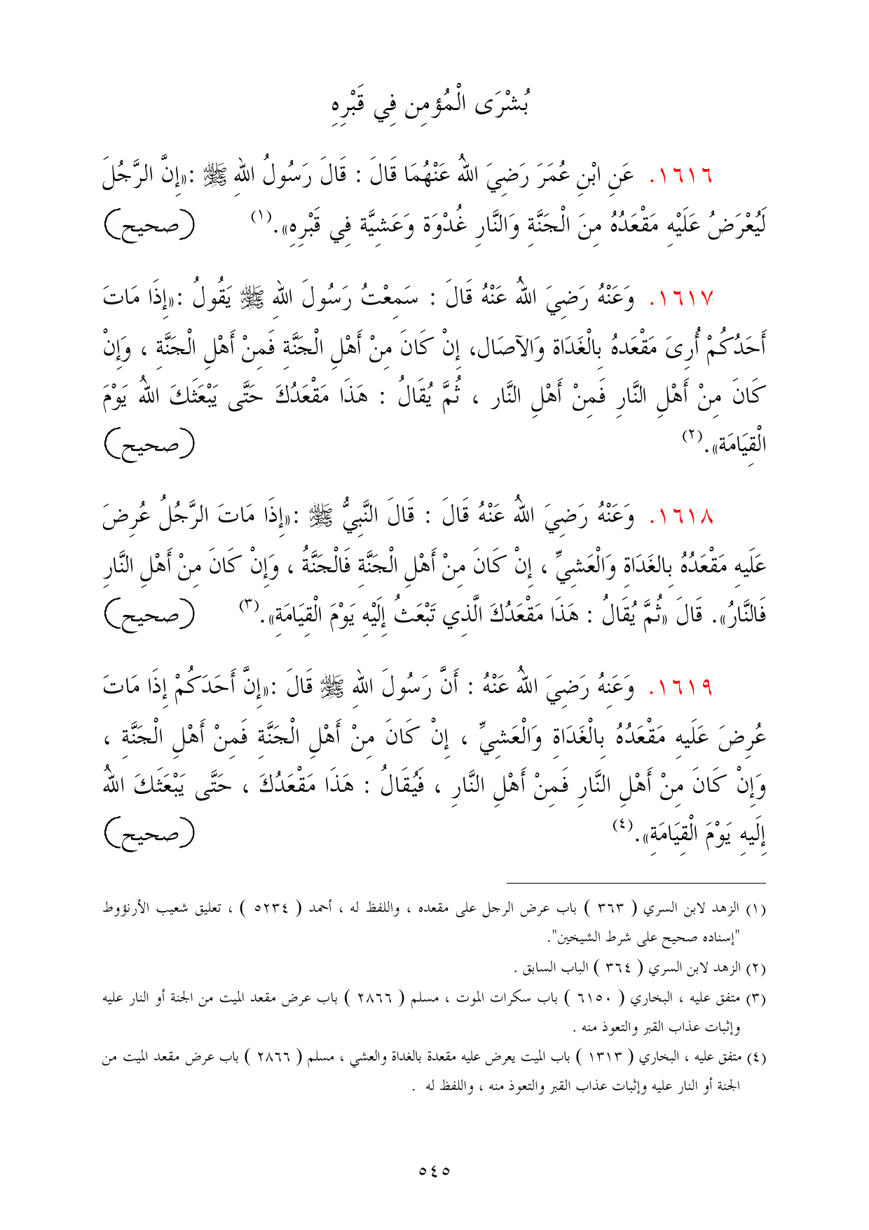 1619 - وَعَنِهُ رَضِيَ اللهُ عَنْهُ: أَنَّ رَسُولَ اللهِ - صلى الله عليه وسلم - قَالَ: «إِنَّ أَحَدَكُمْ إِذَا مَاتَ عُرِضَ عَلَيهِ مَقْعَدُهُ بِالْغَدَاةِ وَالْعَشِيِّ، إِنْ كَانَ مِنْ أَهْلِ الْجَنَّةِ فَمِنْ أَهْلِ الْجَنَّةِ، وَإِنْ كَانَ مِنْ أَهْلِ النَّارِ فَمِنْ أَهْلِ النَّارِ، فَيُقَالُ: هَذَا مَقْعَدُكَ، حَتَّى يَبْعَثَكَ اللهُ إِلَيهِ يَوْمَ الْقِيَامَةِ». (¬4) =صحيح