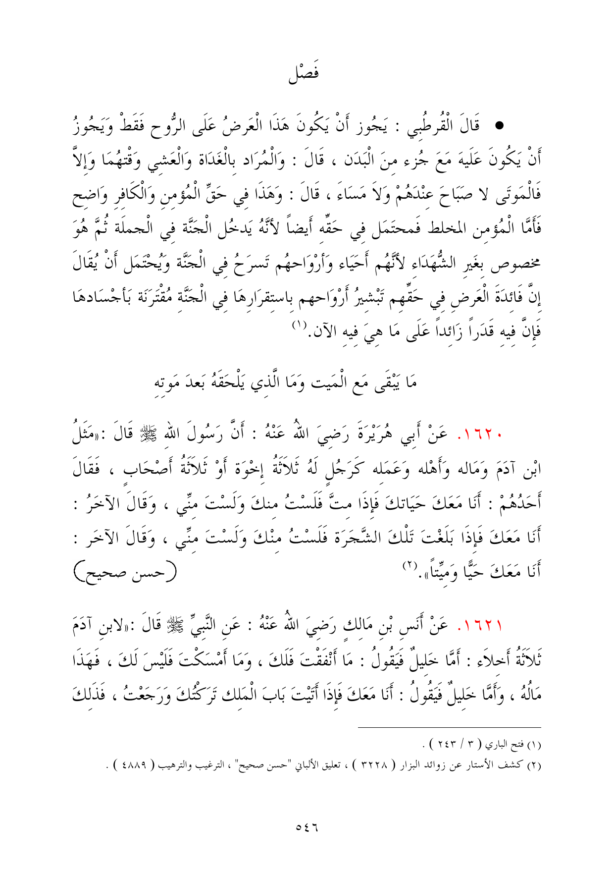 1620 - عَنْ أَبِي هُرَيْرَةَ رَضِيَ اللهُ عَنْهُ: أَنَّ رَسُولَ اللهِ - صلى الله عليه وسلم - قَالَ: «مَثَلُ ابْن آدَمَ وَمَاله وَأَهْله وَعَمَلِه كَرَجُلٍ لَهُ ثَلاَثَةُ إِخْوَة أَوْ ثَلاَثَةُ أَصْحَابٍ، فَقَالَ أَحَدُهُمْ: أَنَا مَعَكَ حَيَاتكَ فَإِذَا مِتَّ فَلَسْتُ مِنكَ وَلَسْتَ مِنِّي، وَقَالَ الآخَرُ: أَنَا مَعَكَ فَإِذَا بَلَغْتَ تَلْكَ الشَّجَرَة فَلَسْتُ مِنْكَ وَلَسْتَ مِنِّي، وَقَالَ الآخَر: أَنَا مَعَكَ حَيًّا وَمِيِّتاً». (¬2) =حسن صحيح
